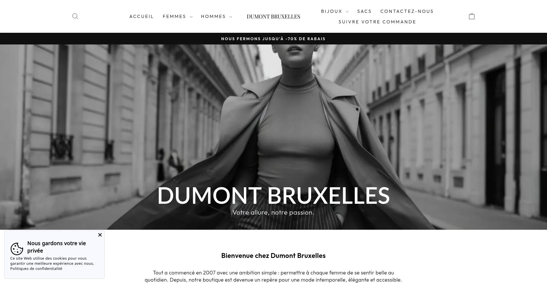 Analysis indicates that dumont-bruxelles.com operates as an e-commerce platform facilitating online transactions for goods or services. The website implements shopping cart functionality, payment processing systems, and product catalog features typical of commercial retail operations.