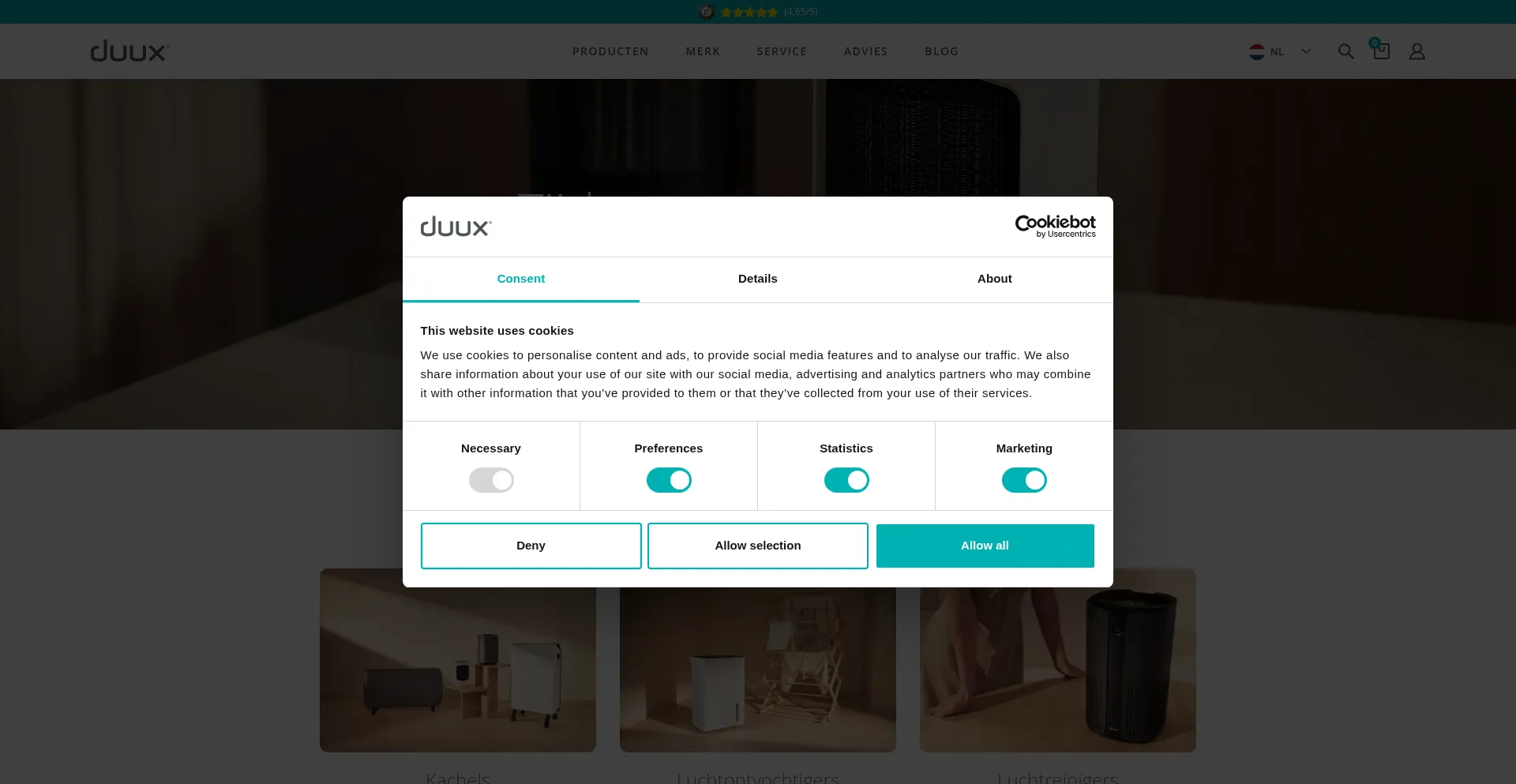 The website implements cookie consent mechanisms in compliance with privacy regulations such as GDPR or CCPA. This demonstrates that duux.com adheres to data protection standards and provides users with control over personal data collection practices.