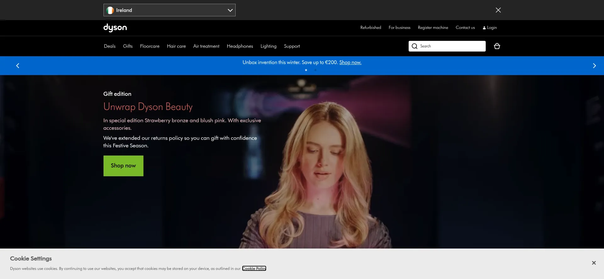 Analysis indicates that dyson.ie operates as an e-commerce platform facilitating online transactions for goods or services. The website implements shopping cart functionality, payment processing systems, and product catalog features typical of commercial retail operations.