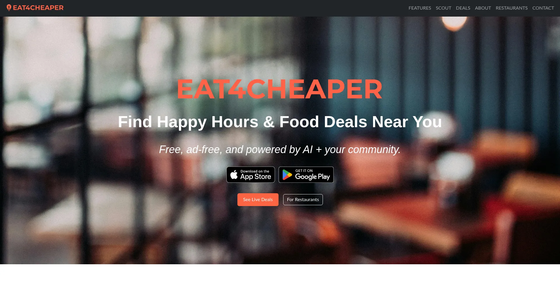 Find happy hours and food deals near you with Eat4Cheaper. Free app powered by AI Scout finds local restaurant specials and drink deals. Download for iOS & Android.