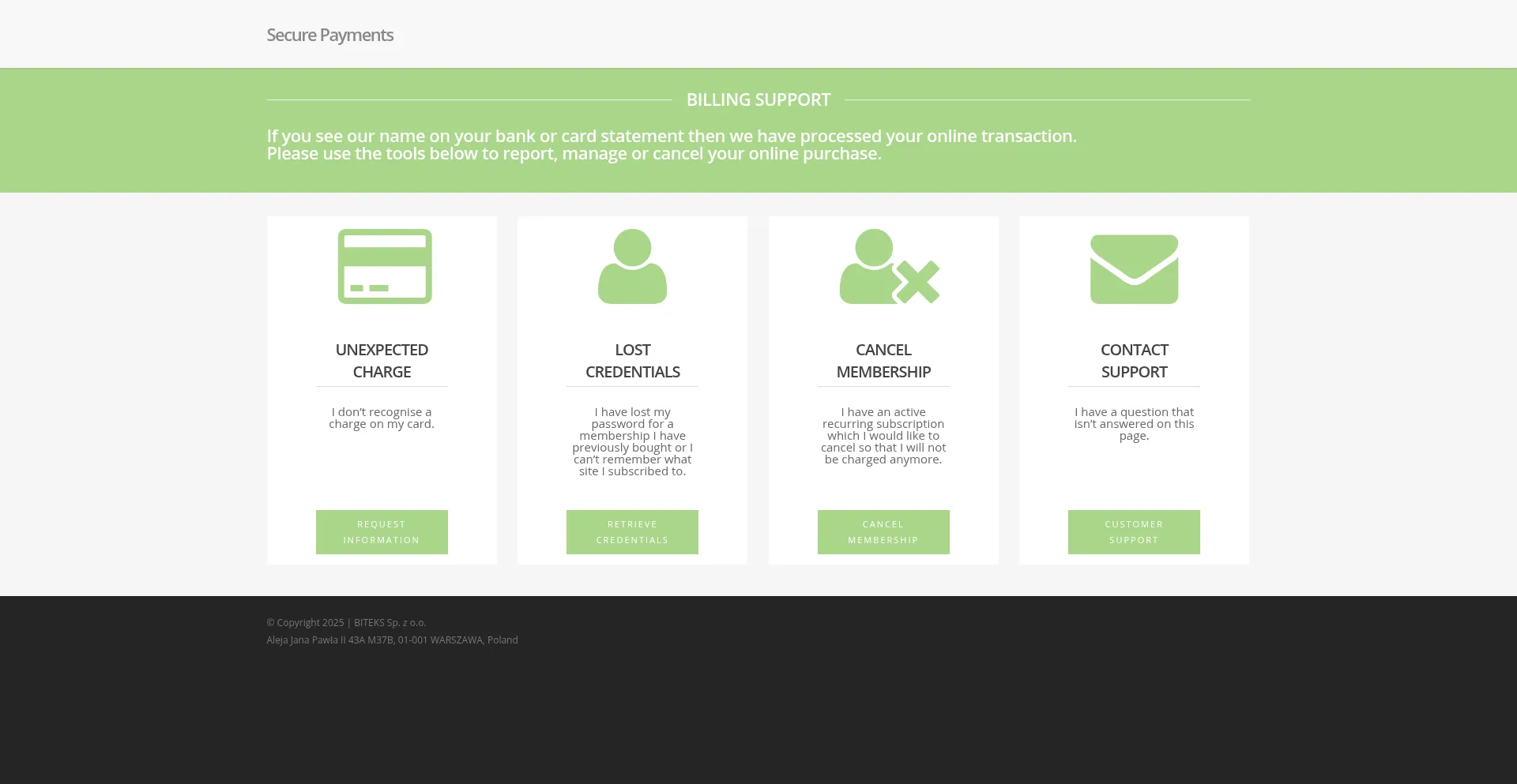 The website contains dedicated sections addressing payment disputes, subscription management, chargeback procedures, refund policies, and other financial transaction concerns, indicating established billing operations.