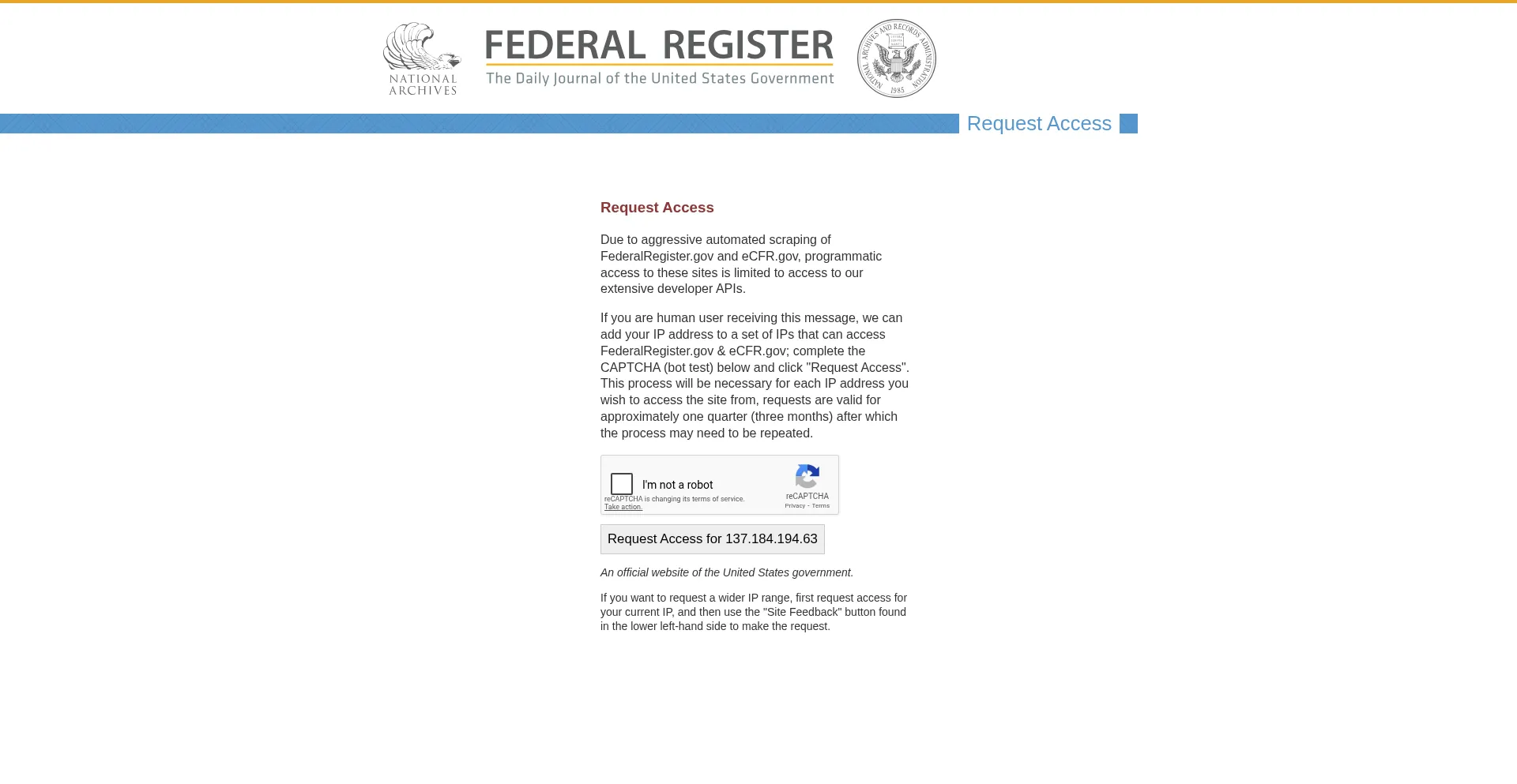Due to aggressive automated scraping of FederalRegister.gov and eCFR.gov, programmatic access to these sites is limited to access to our extensive developer APIs.
