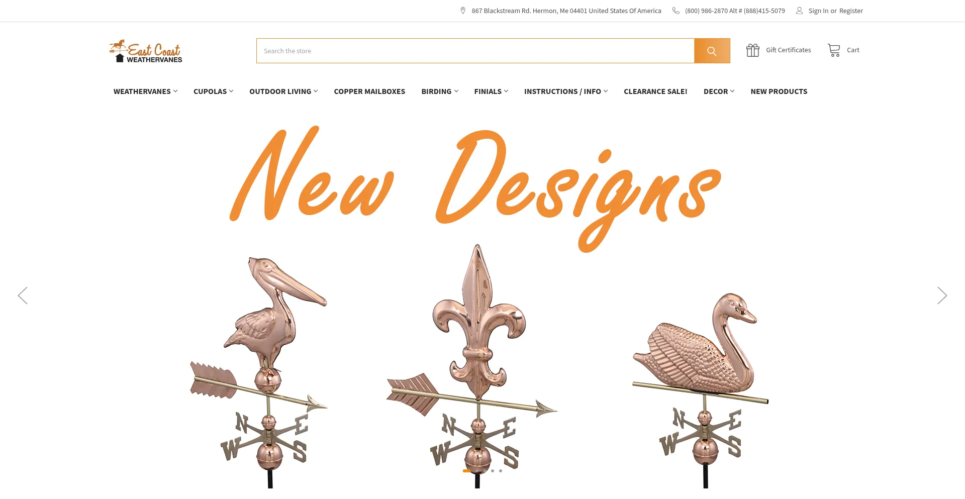 East Coast Weathervanes offers the widest selection of weathervanes, cupolas, copper finails, yard and garden, and indoor/outdoor copper and steel products.