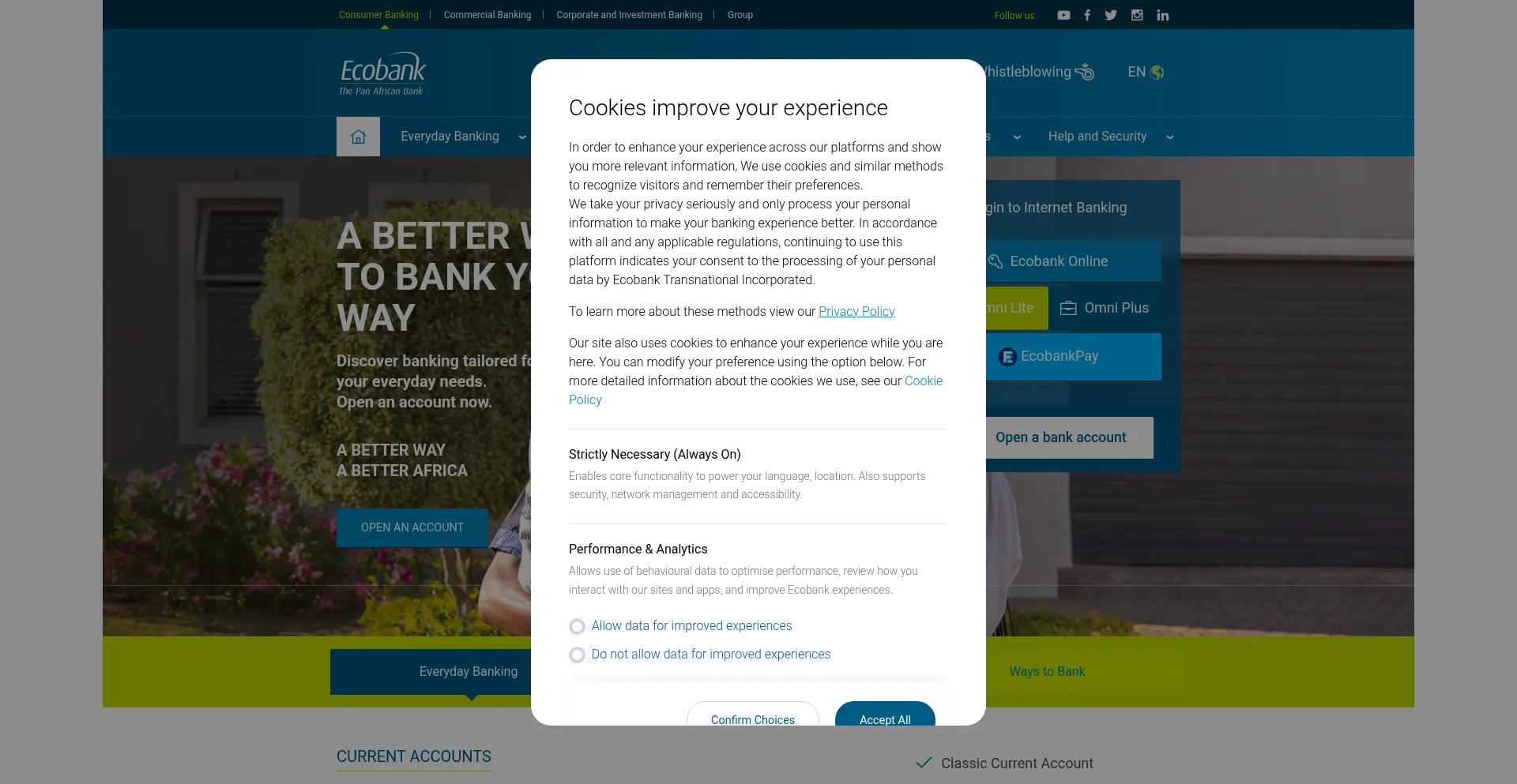 The website implements cookie consent mechanisms in compliance with privacy regulations such as GDPR or CCPA. This demonstrates that ecobank.com adheres to data protection standards and provides users with control over personal data collection practices.