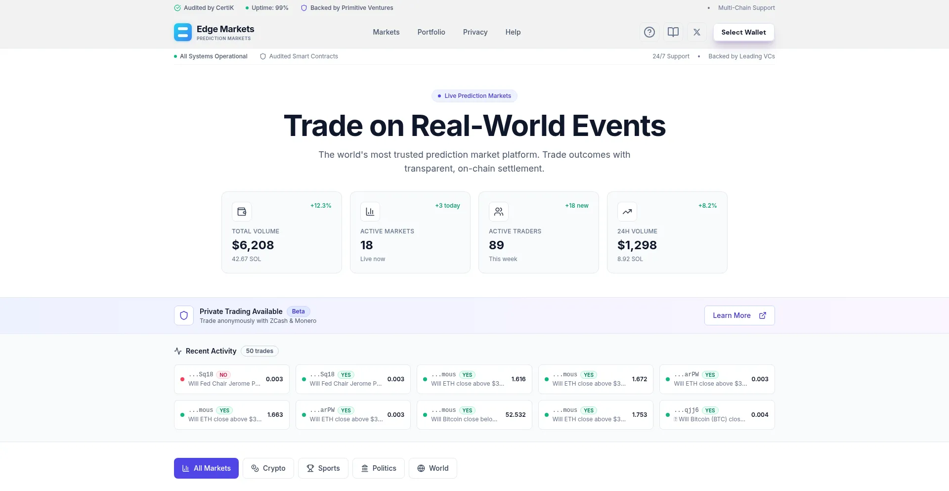 Prediction markets with SOL/USDC and privacy integrations with ZEC/XMR for absolute privacy with your bets.