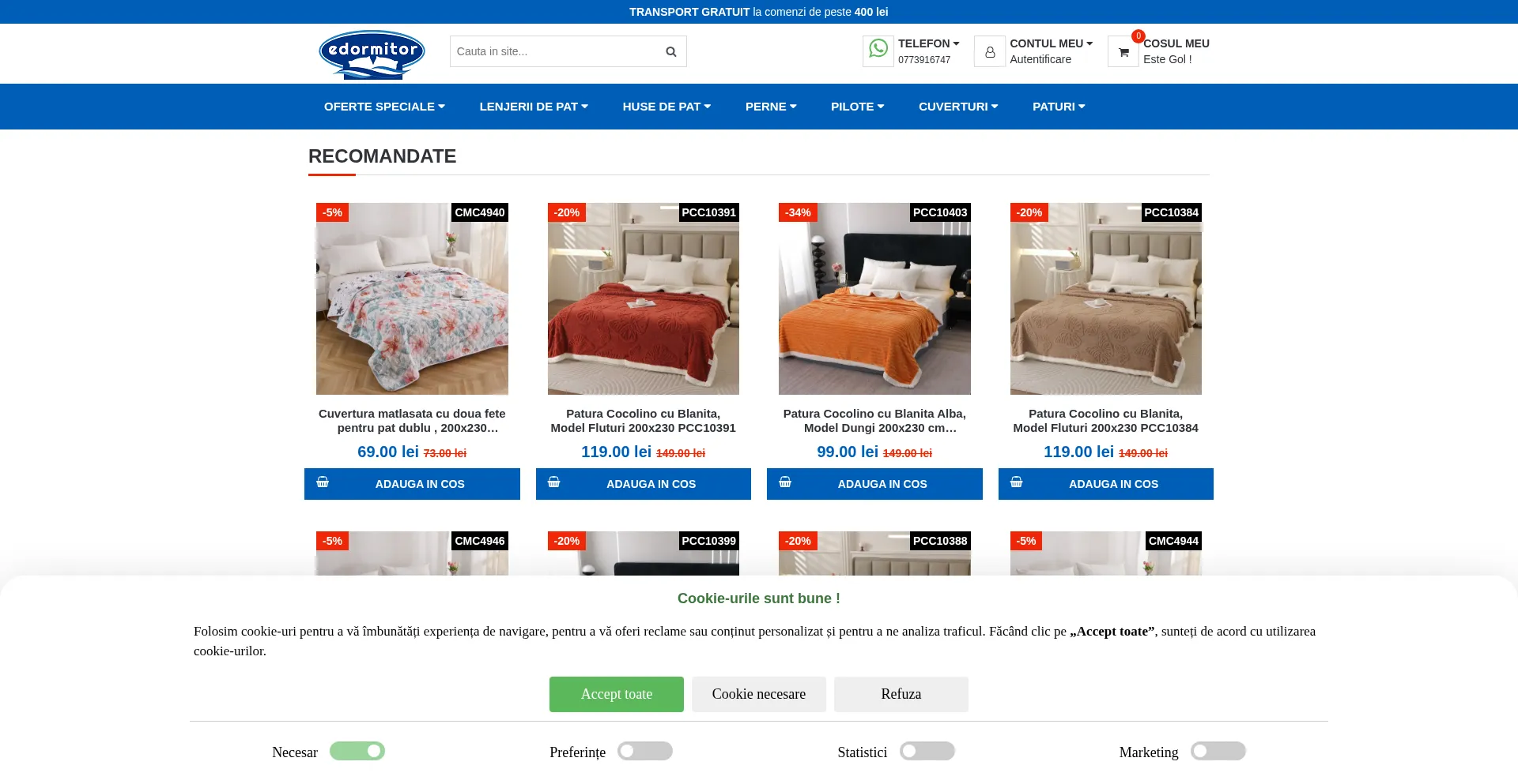 Magazin online: seturi pilote si perne din puf de gasca, lenjerii de pat bumbac 100%, cuverturi bumbac, asternuturi de pat ieftine, modele diverse.