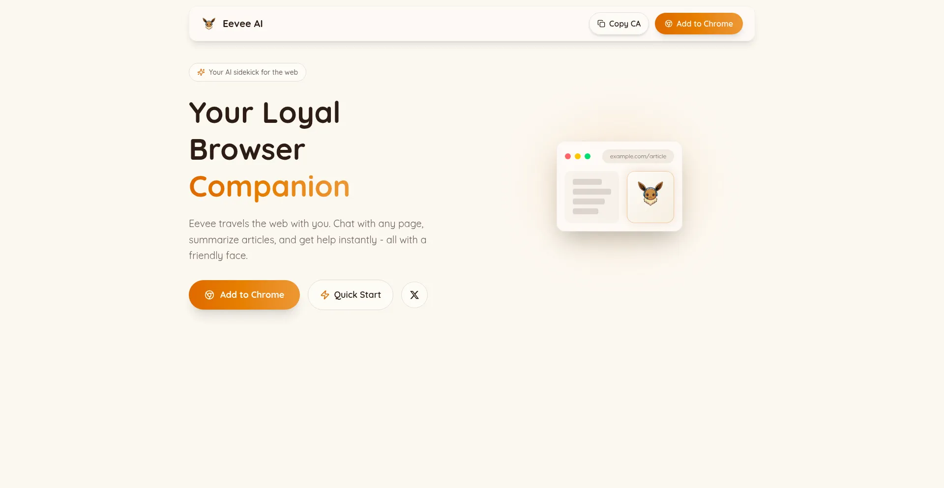 Chat with any webpage, summarize articles, and get help instantly with Eevee AI - the friendly Chrome extension that travels the web with you.