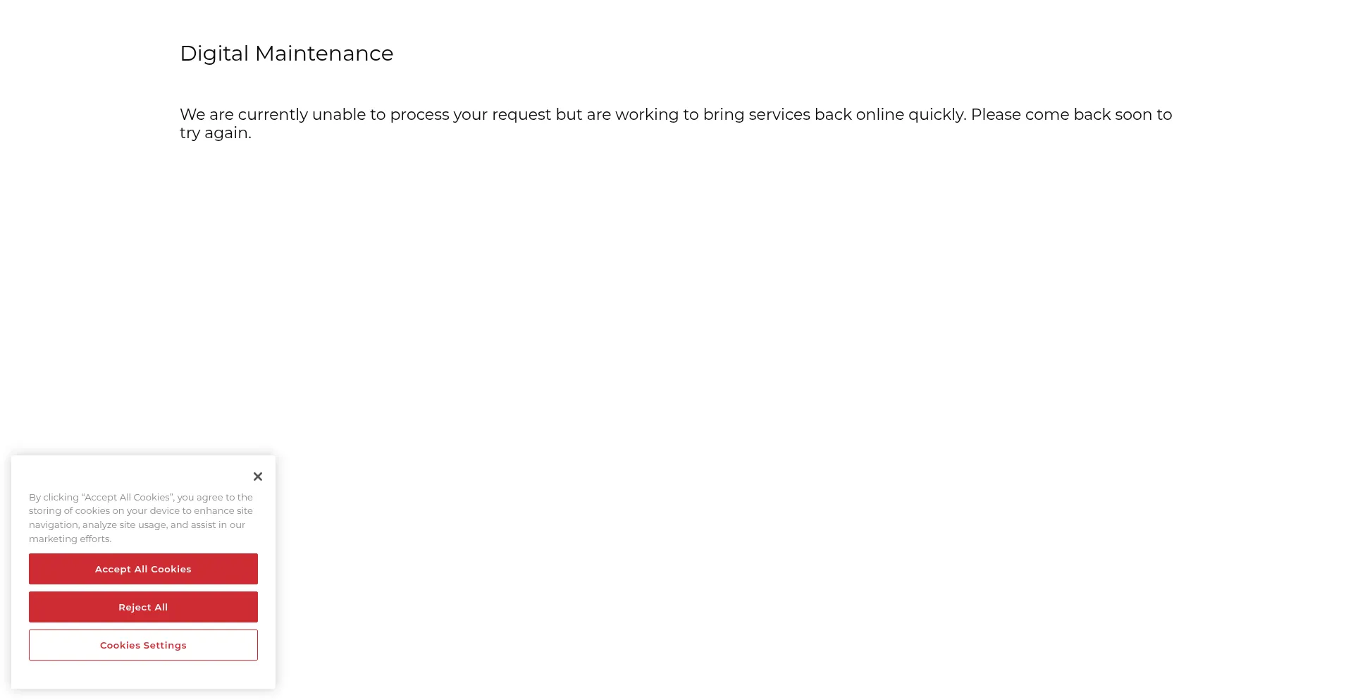 We are currently unable to process your request but are working to bring services back online quickly. Please come back soon to try again.