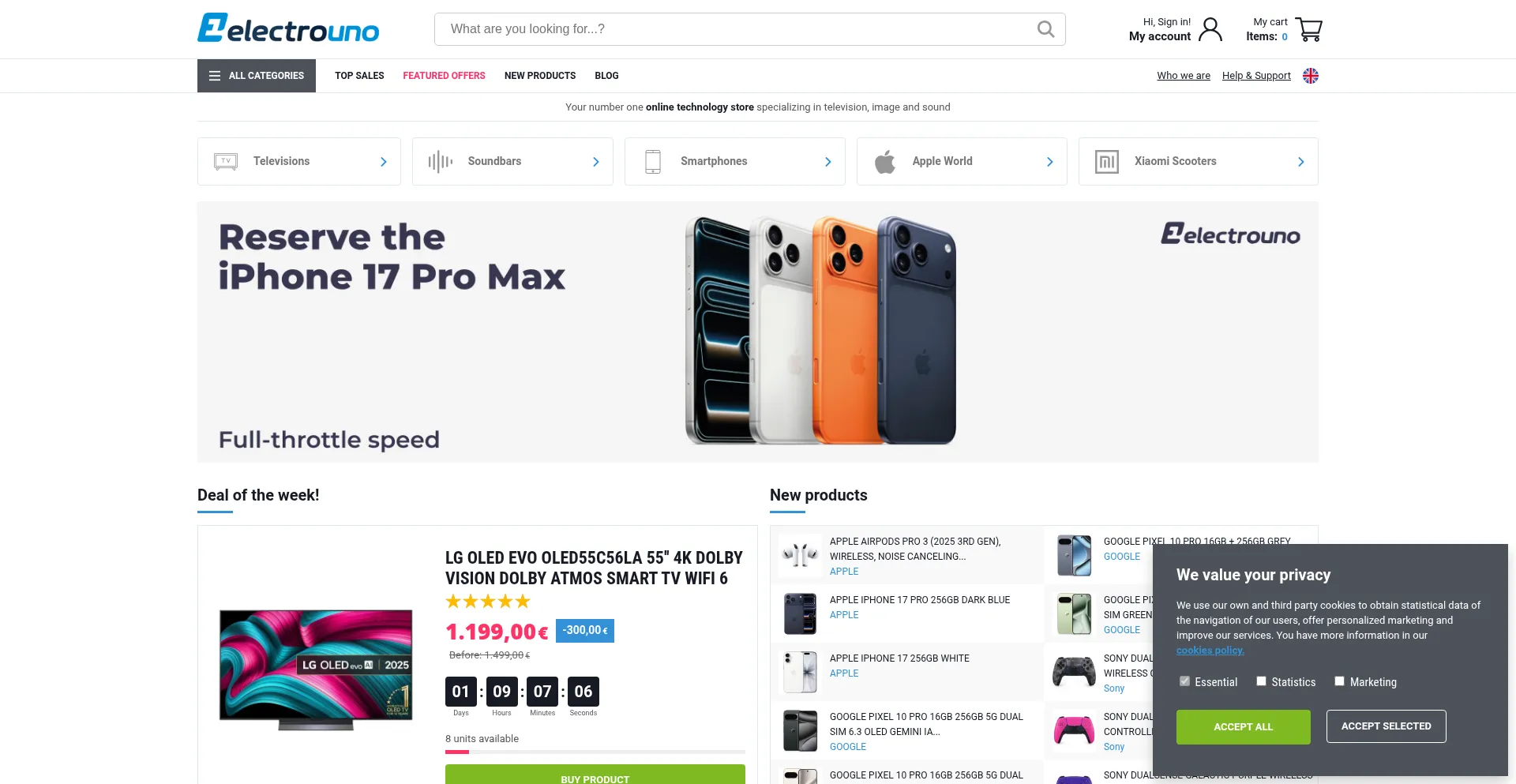 The website leverages popular product names and brands to attract traffic and generate user interest. These products may be offered through promotional campaigns or discount strategies designed to increase visitor engagement and conversion rates for electrouno.es.