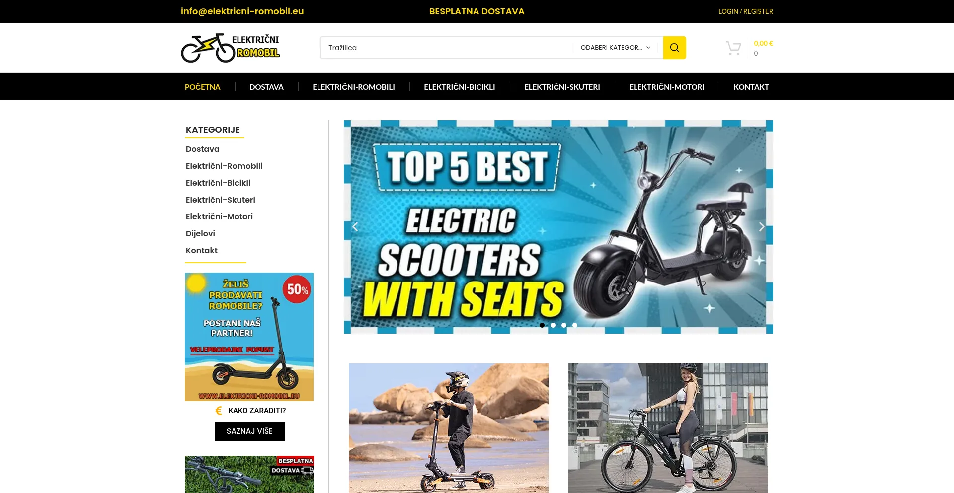 Analysis indicates that elektricni-romobil.eu operates as an e-commerce platform facilitating online transactions for goods or services. The website implements shopping cart functionality, payment processing systems, and product catalog features typical of commercial retail operations.