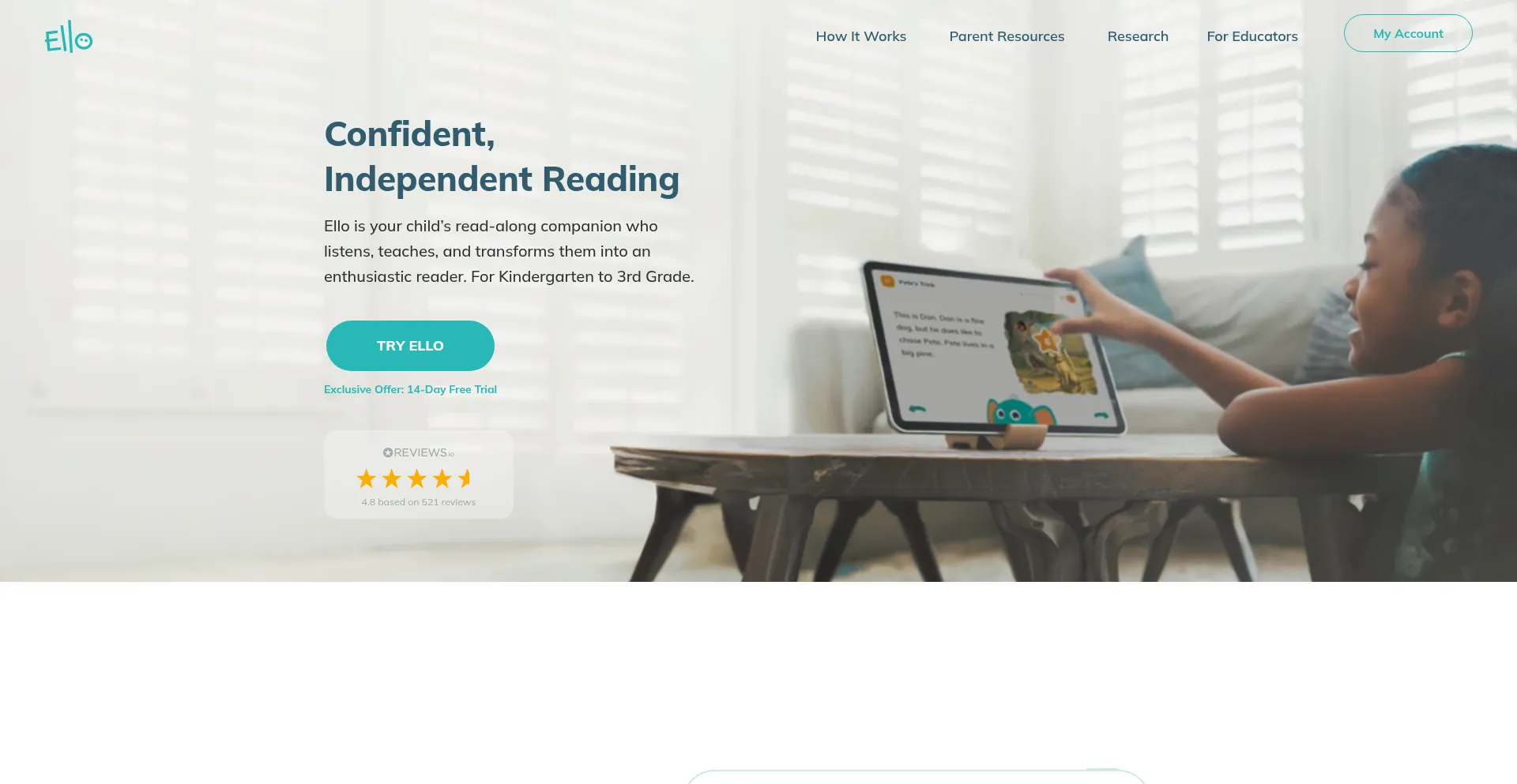 Ello is your child’s read-along companion who listens, teaches, and transforms them into an enthusiastic reader. For Kindergarten to 3rd Grade.