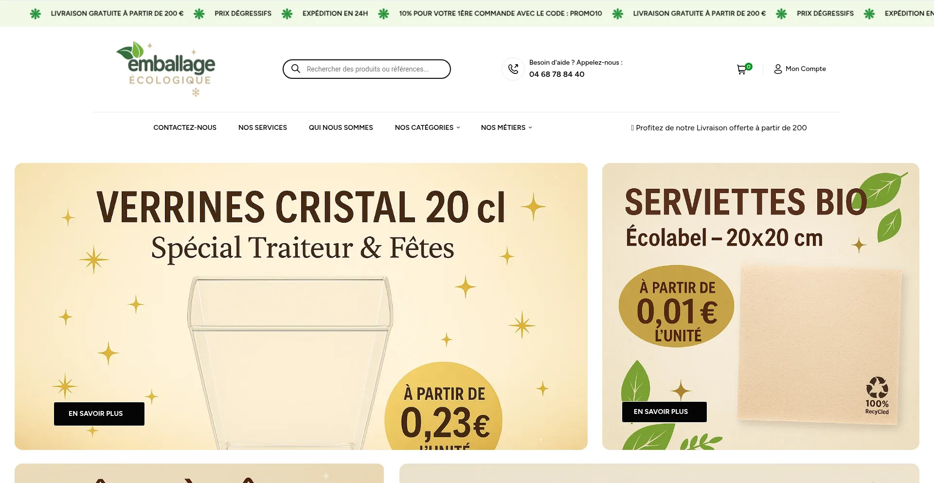 Analysis indicates that emballageecologique.com operates as an e-commerce platform facilitating online transactions for goods or services. The website implements shopping cart functionality, payment processing systems, and product catalog features typical of commercial retail operations.
