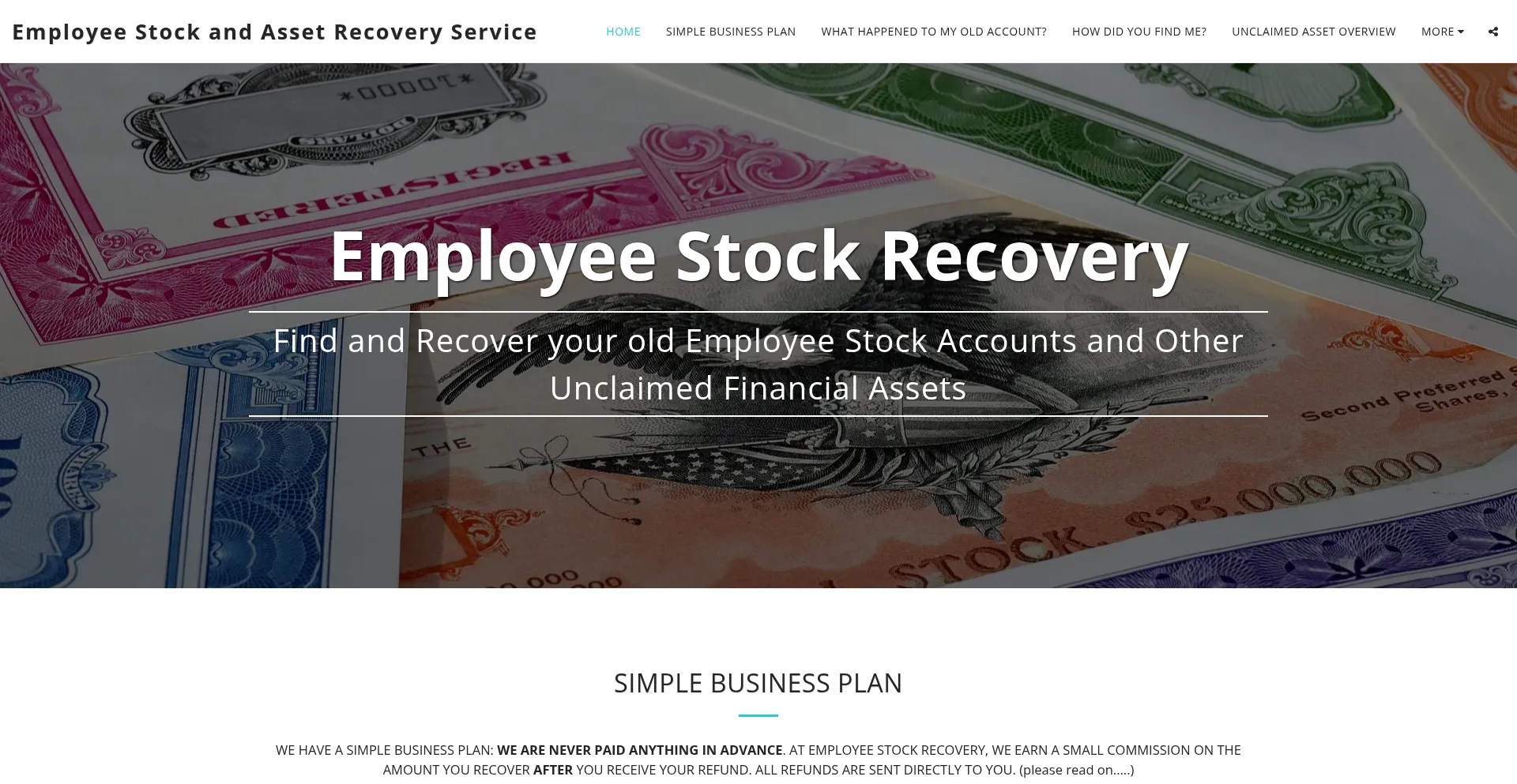 The website employeestockrecovery.com advertises fund recovery services for lost or stolen assets. While some operate on contingency fee structures, others may require upfront payments, which can indicate fraudulent operations. Verify credentials and regulatory compliance before engaging such services.