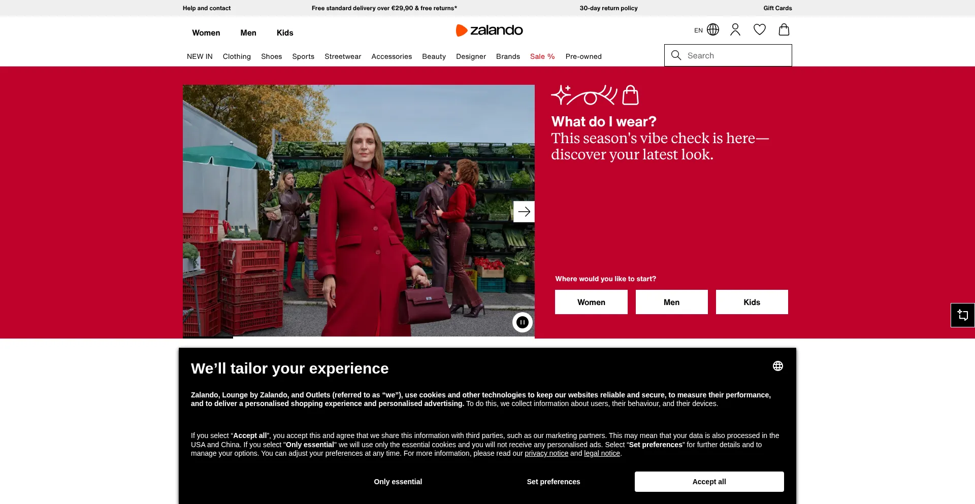 Analysis indicates that en.zalando.de operates as an e-commerce platform facilitating online transactions for goods or services. The website implements shopping cart functionality, payment processing systems, and product catalog features typical of commercial retail operations.
