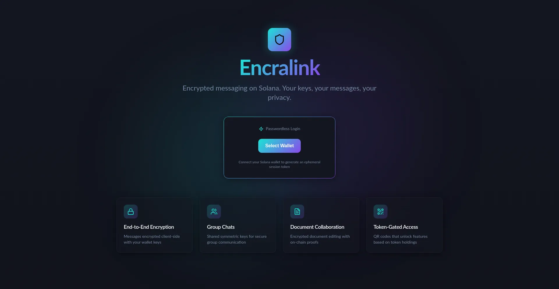 Secure, encrypted messaging and collaboration platform built on Solana. End-to-end encryption with wallet-based identity.