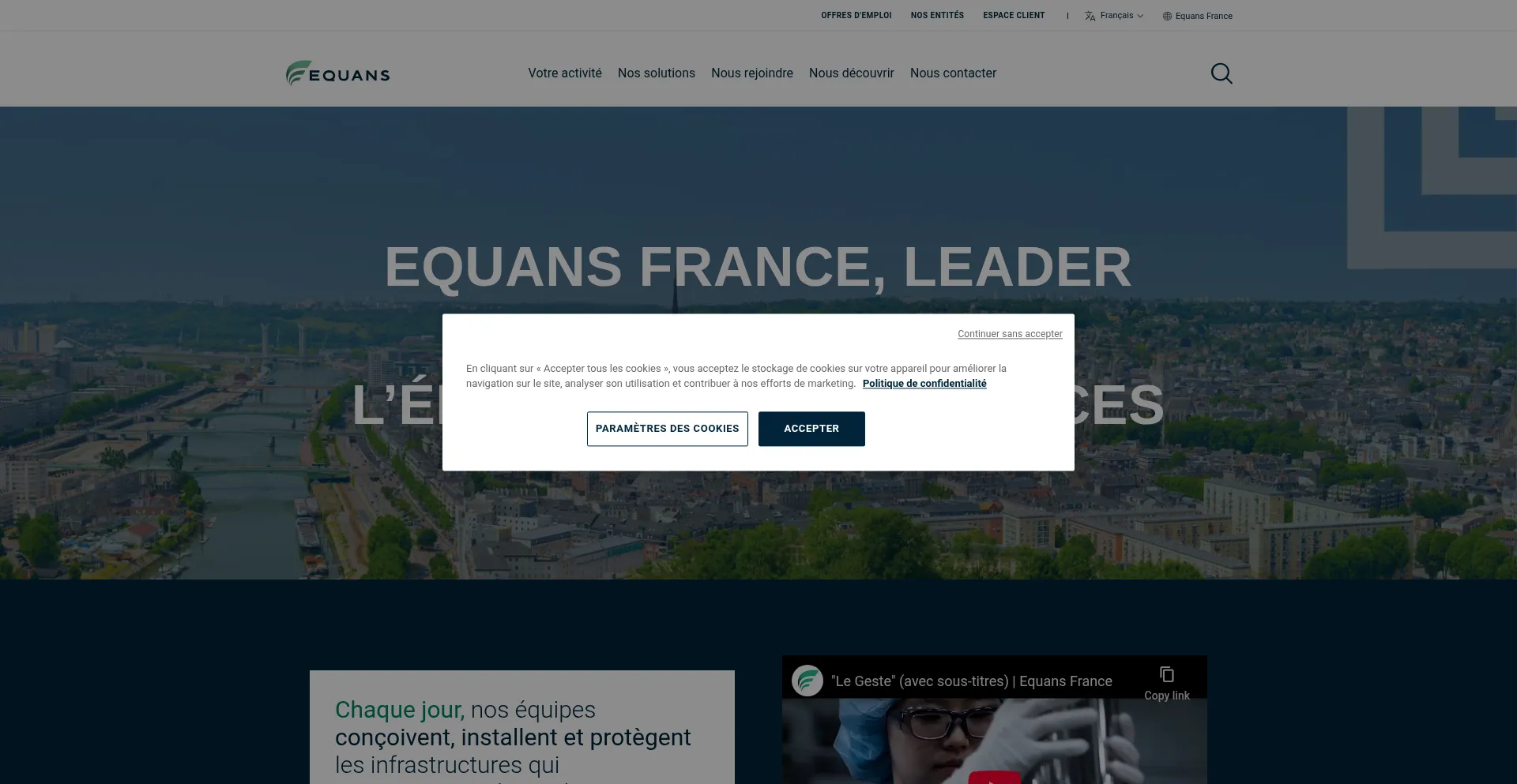 The website implements cookie consent mechanisms in compliance with privacy regulations such as GDPR or CCPA. This demonstrates that equans.fr adheres to data protection standards and provides users with control over personal data collection practices.