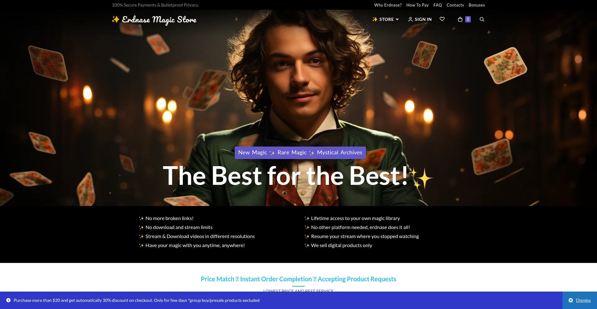 www.erdnasemagicstore.io is a piracy website that illegally distributes and sells copyrighted magic instructional PDFs and videos without authorization. The site profits from the sale of infringing material, depriving creators of their rightful income. It should be flagged as a pirate store engaged in copyright infringement.
