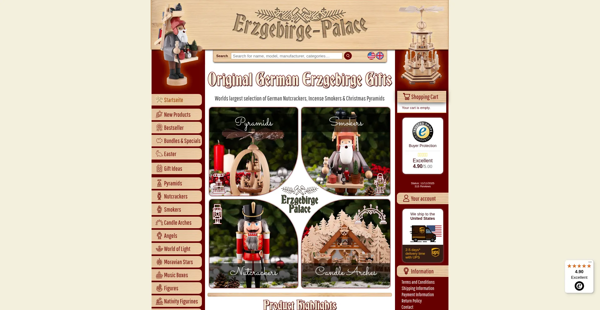 Buy authentic German Erzgebirge Handcrafts. The Erzgebirge-Palace has a wide selection of German Nutcrackers, Christmas Pyramids, Smokers & Candle Arches