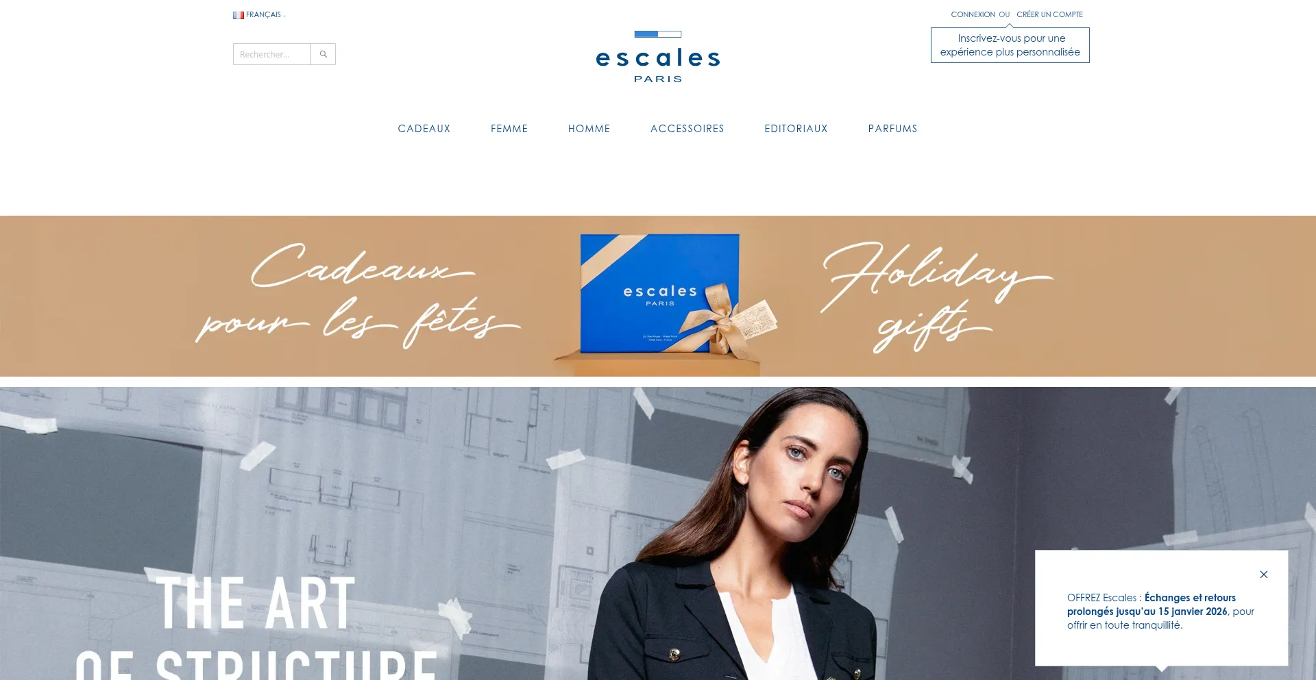 Analysis indicates that escales-paris.com operates as an e-commerce platform facilitating online transactions for goods or services. The website implements shopping cart functionality, payment processing systems, and product catalog features typical of commercial retail operations.