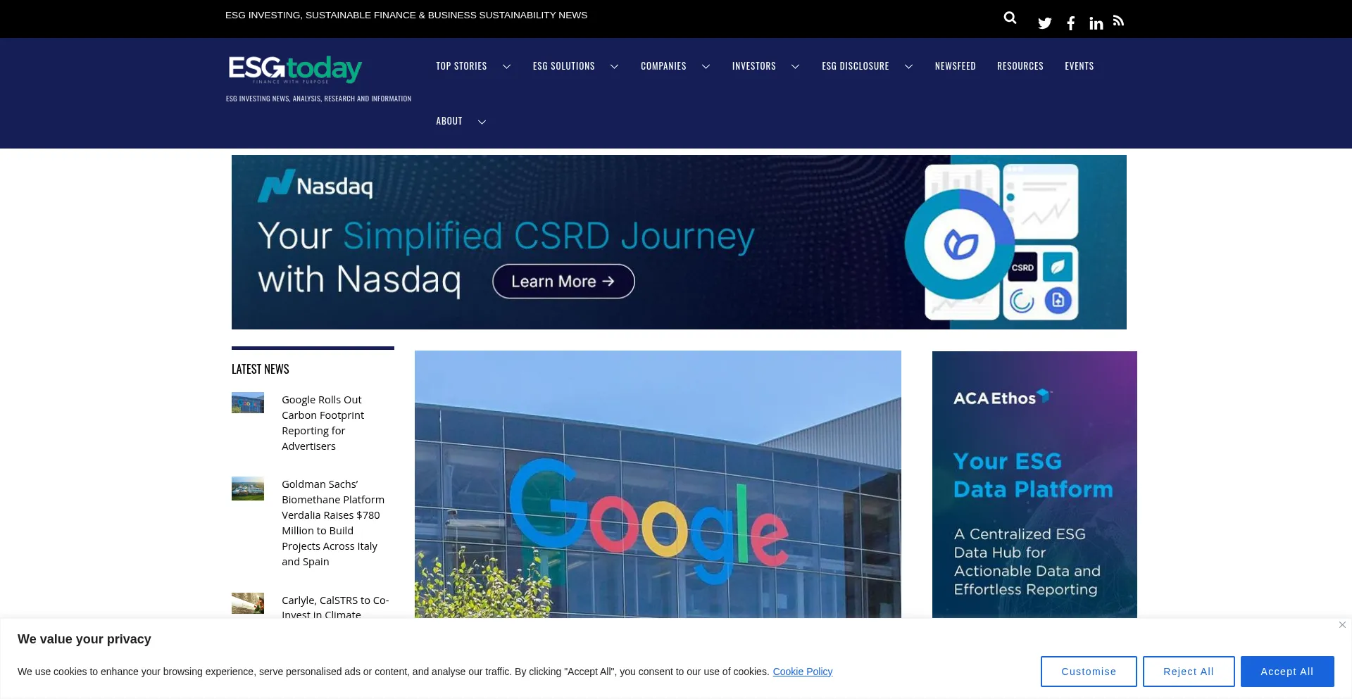 The website implements cookie consent mechanisms in compliance with privacy regulations such as GDPR or CCPA. This demonstrates that esgtoday.com adheres to data protection standards and provides users with control over personal data collection practices.