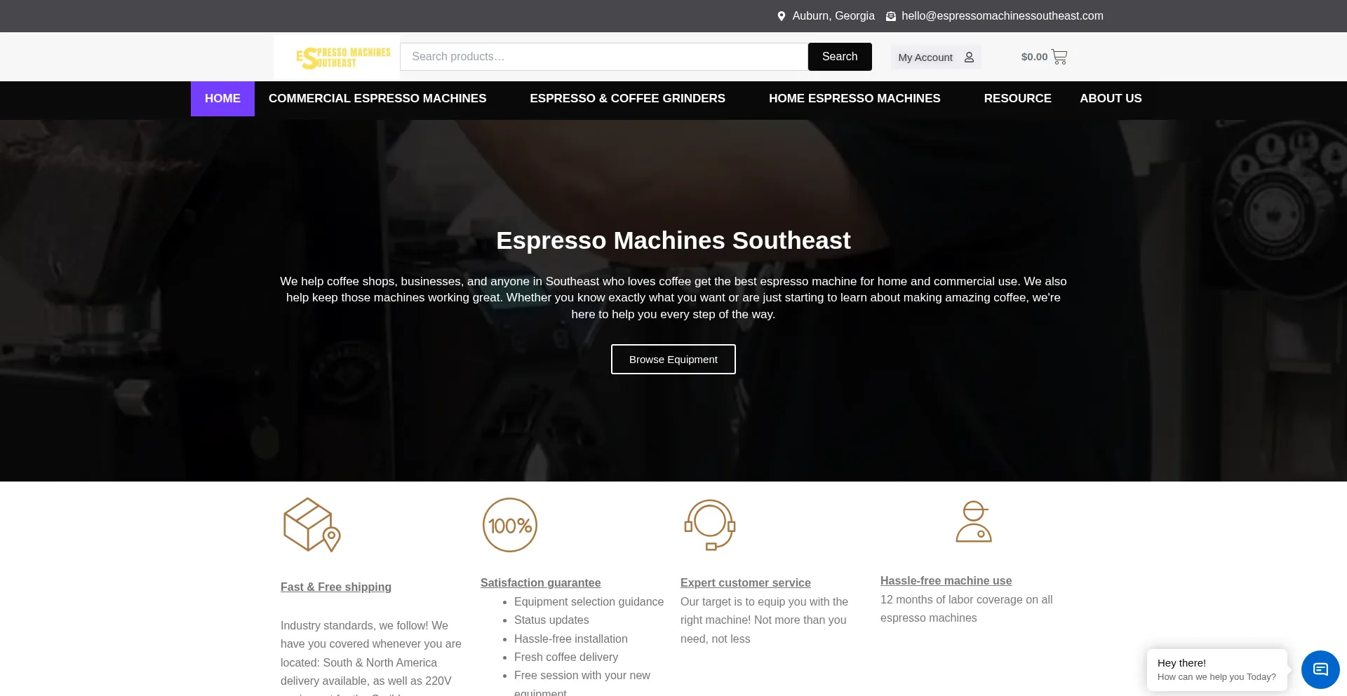 Analysis indicates that espressomachinessoutheast.com operates as an e-commerce platform facilitating online transactions for goods or services. The website implements shopping cart functionality, payment processing systems, and product catalog features typical of commercial retail operations.