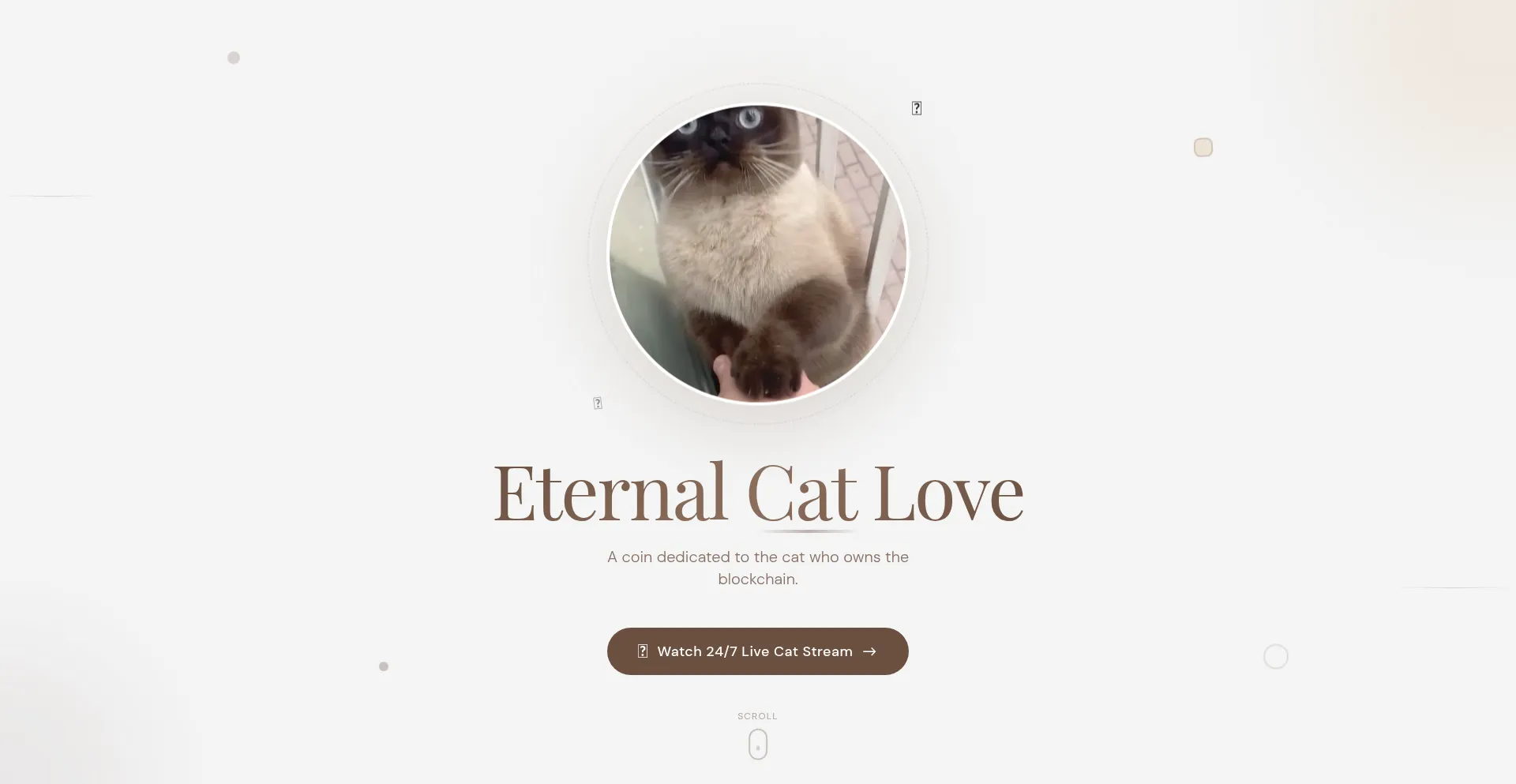 A coin dedicated to the cat who owns the blockchain. 24/7 live cat streaming, eternal love, and pure serotonin.