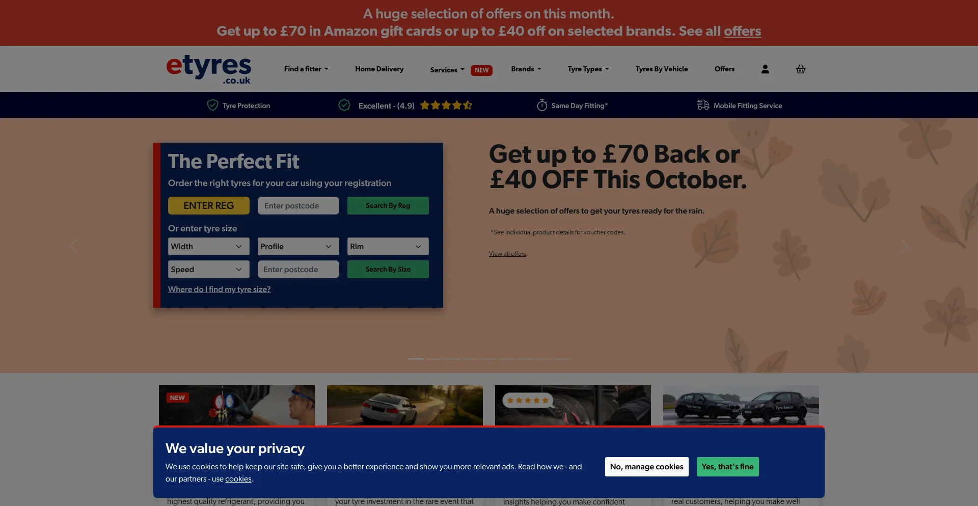 The website implements cookie consent mechanisms in compliance with privacy regulations such as GDPR or CCPA. This demonstrates that etyres.co.uk adheres to data protection standards and provides users with control over personal data collection practices.