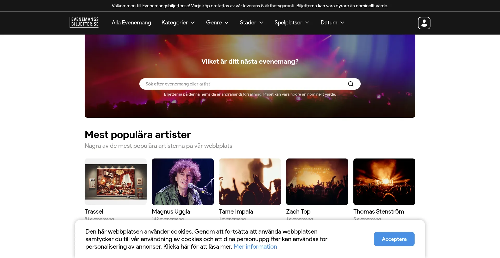 The evenemangsbiljetter.se website uses Google Tag Manager to add and update tracking tags on its website.