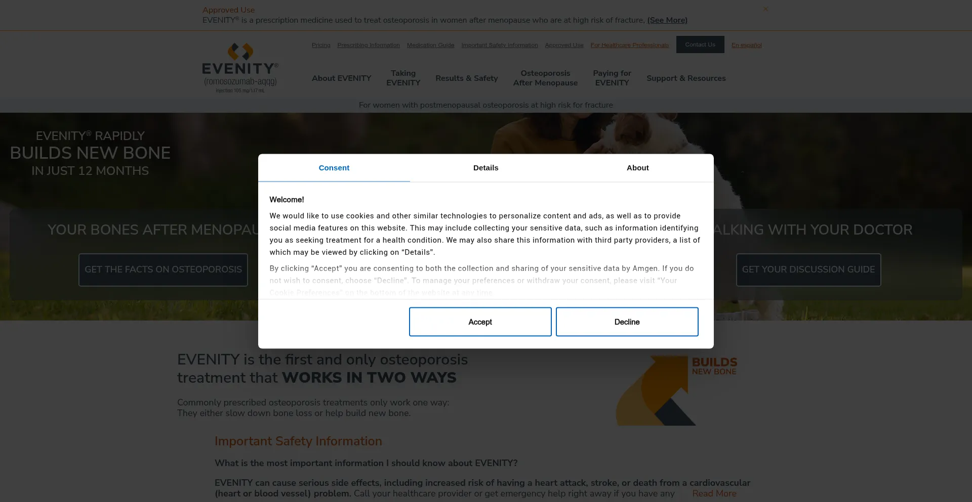 Learn more about EVENITY®, a prescription treatment for women with postmenopausal osteoporosis that can help build bone in just 12 months. See Full Prescribing & Safety Info.