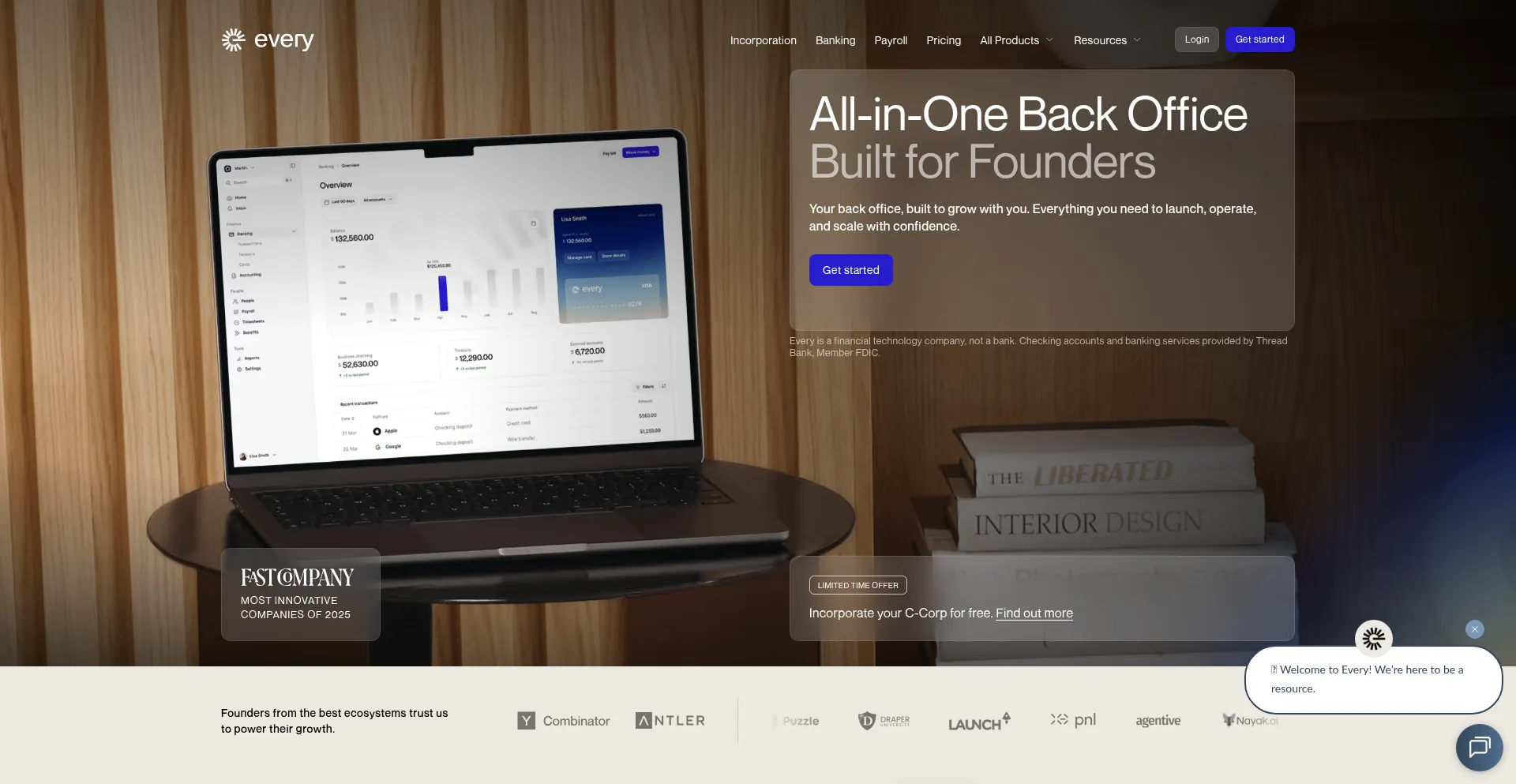 Start your company the right way. With Every, you can incorporate your startup and open a business bank account—all in under a week. Built for founders who move fast.