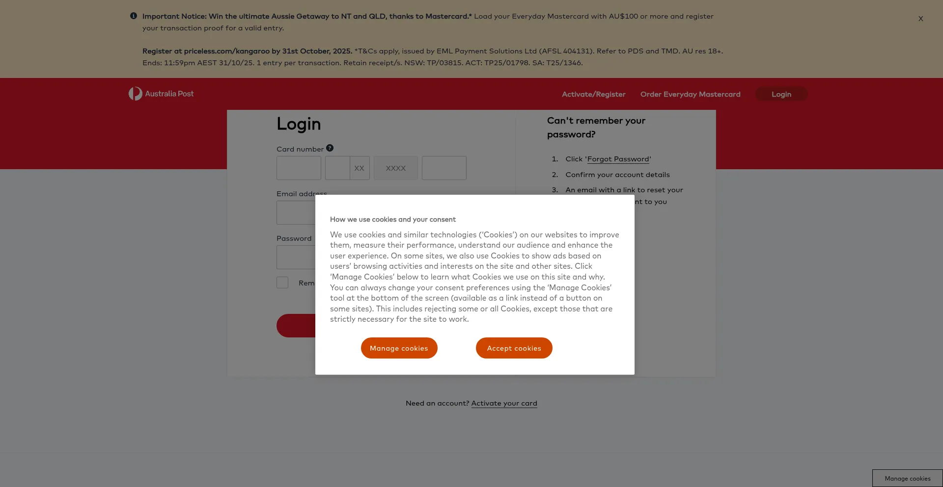 The website implements cookie consent mechanisms in compliance with privacy regulations such as GDPR or CCPA. This demonstrates that everyday.card.auspost adheres to data protection standards and provides users with control over personal data collection practices.