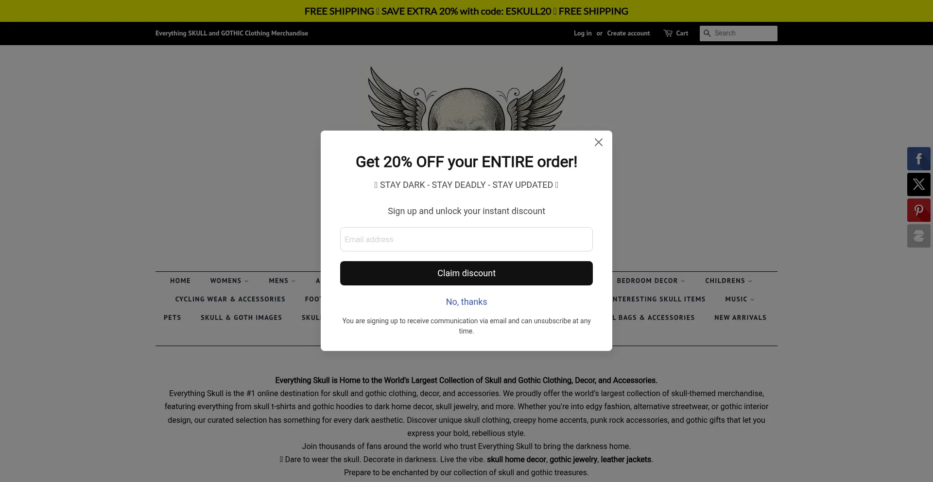 The everythingskull.com website utilizes free e-commerce platform solutions, which may indicate cost-conscious operations but could also suggest limitations in security features, customer support, or advanced functionality compared to enterprise-grade solutions.