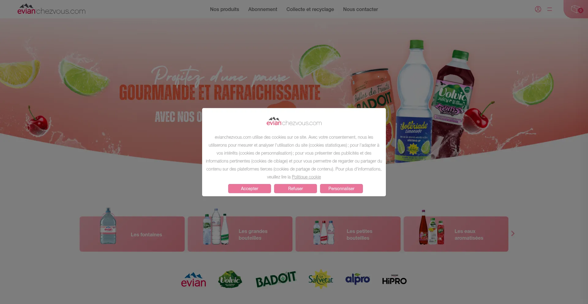 Evian Chez Vous livre vos produits préférés : Evian, Volvic, Badoit, La Salvetat, Candia, Alpro, Hipro, Alain Milliat, Michel & Augustin, Kusmeta Tea, illy, sur le Grand Paris.