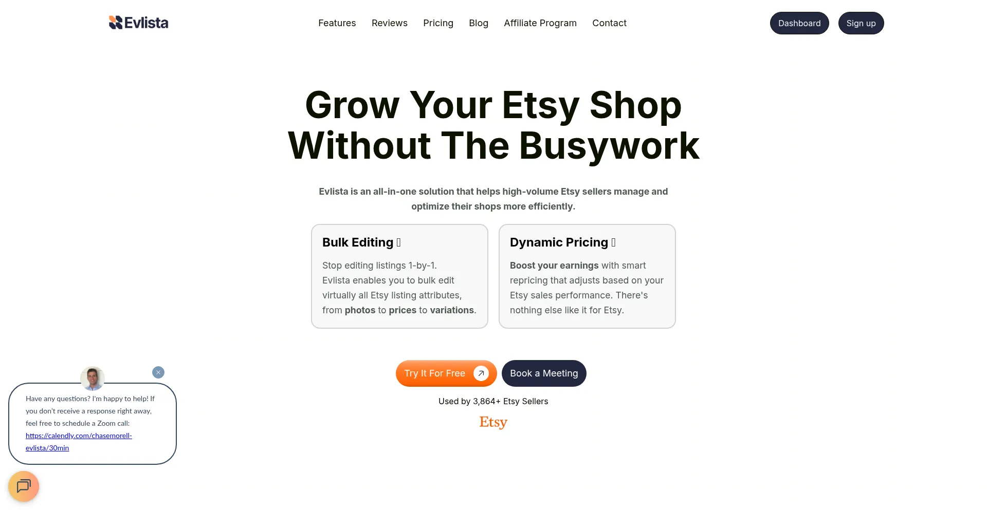 The most powerful bulk editor for Etsy. Over 2,000 sellers use Evlista to bulk edit photos, variations, and more across listings. Connect your Etsy shop in seconds. Start for free.