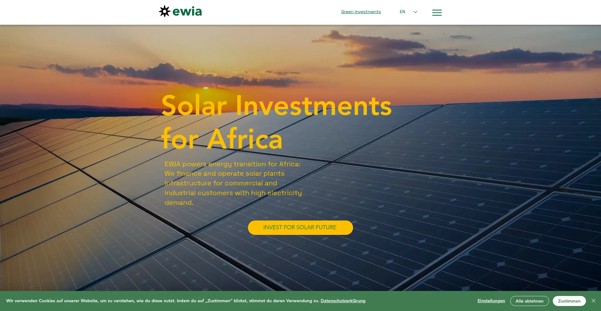 EWIA Green Investments GmbH ist ein Impact Unternehmen welches Solaranlagen finanziert und betreibt für Gewerbe- und Industriekunden in Subsahara-Afrika.