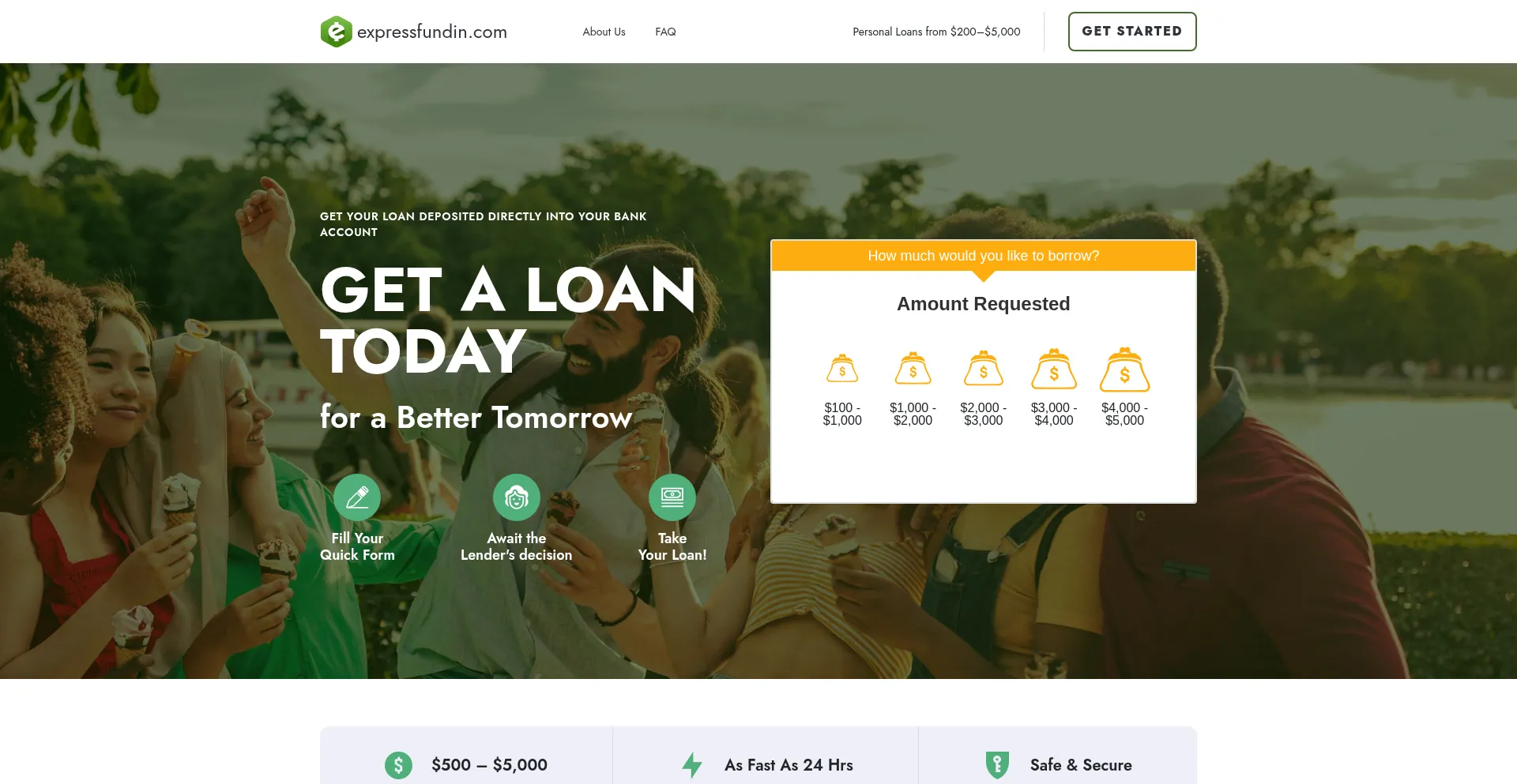 Personal Loans · $500 – $5,000 · Available 24/7 · Easy Online Form · Go to expressfundin.com · Lender-Approval in Minutes · Cash As Soon As Tomorrow · All Credit Types ...