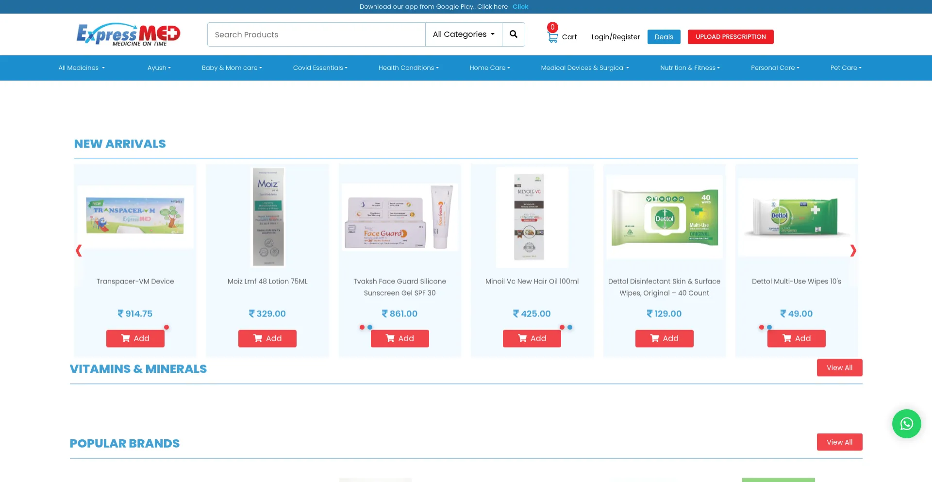 The expressmed.in website offers a mobile application for Android devices, indicating expanded platform presence beyond web-based services.