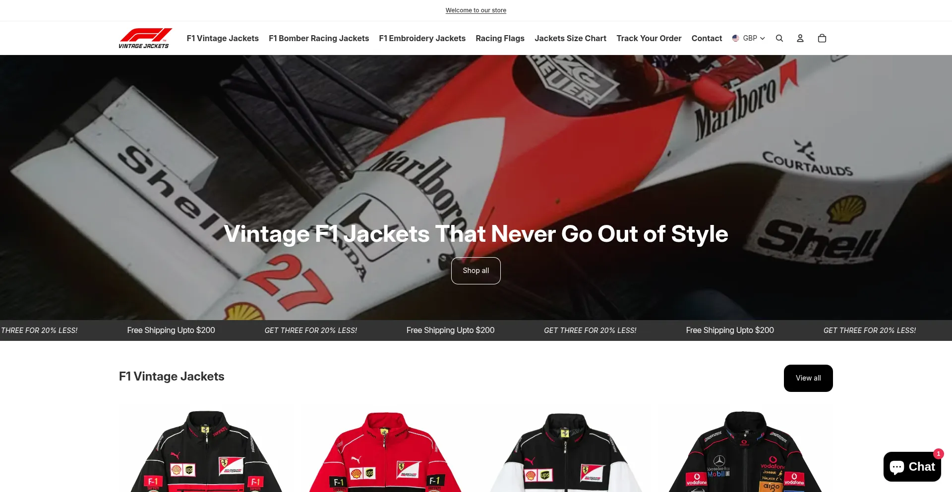 Analysis indicates that f1vintagejackets.com operates as an e-commerce platform facilitating online transactions for goods or services. The website implements shopping cart functionality, payment processing systems, and product catalog features typical of commercial retail operations.