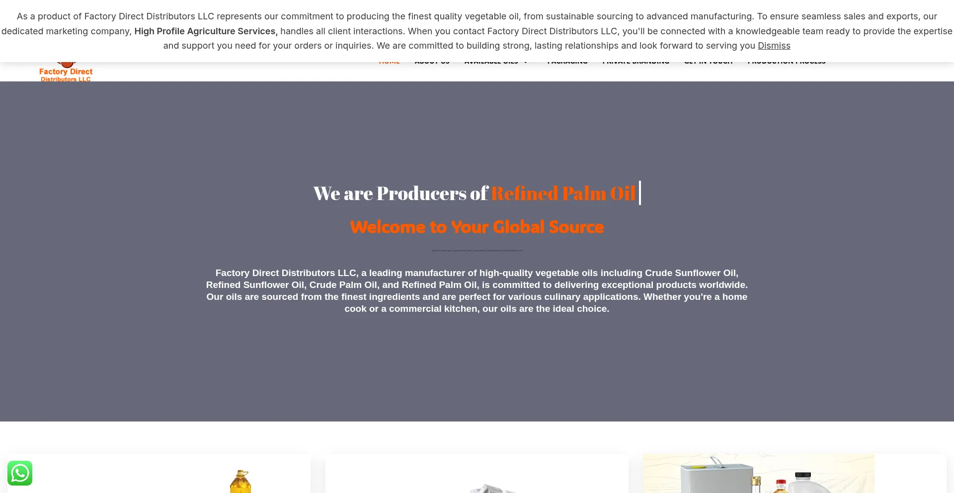 Factory Direct Distributors LLC, a leading manufacturer of high-quality vegetable oils including Crude Sunflower Oil, Refined Sunflower Oil, Crude Palm Oil, and Refined Palm Oil,