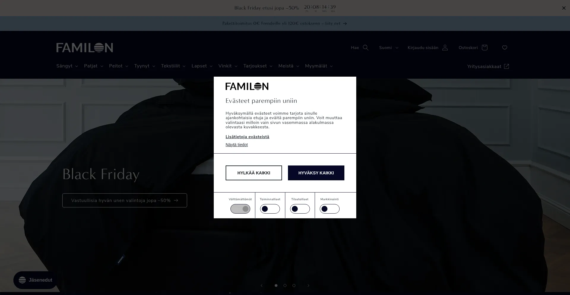 Analysis indicates that familon.fi operates as an e-commerce platform facilitating online transactions for goods or services. The website implements shopping cart functionality, payment processing systems, and product catalog features typical of commercial retail operations.