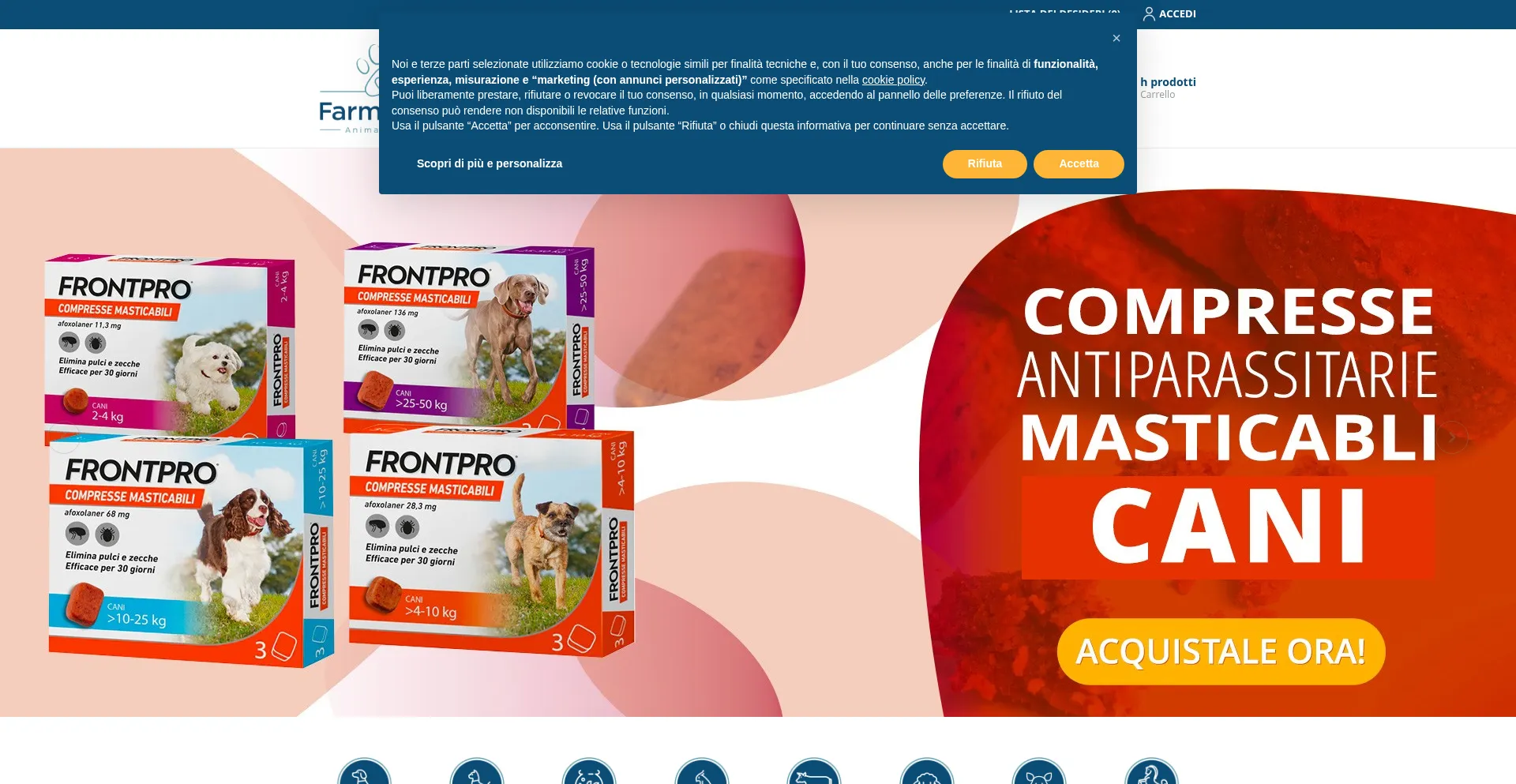 The website implements cookie consent mechanisms in compliance with privacy regulations such as GDPR or CCPA. This demonstrates that farmapets.it adheres to data protection standards and provides users with control over personal data collection practices.