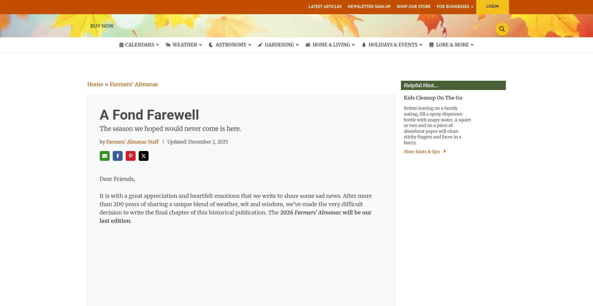 After more than 200 years of sharing wit and wisdom, the 2026 Farmers' Almanac will be our last edition. But our story stays alive in you.