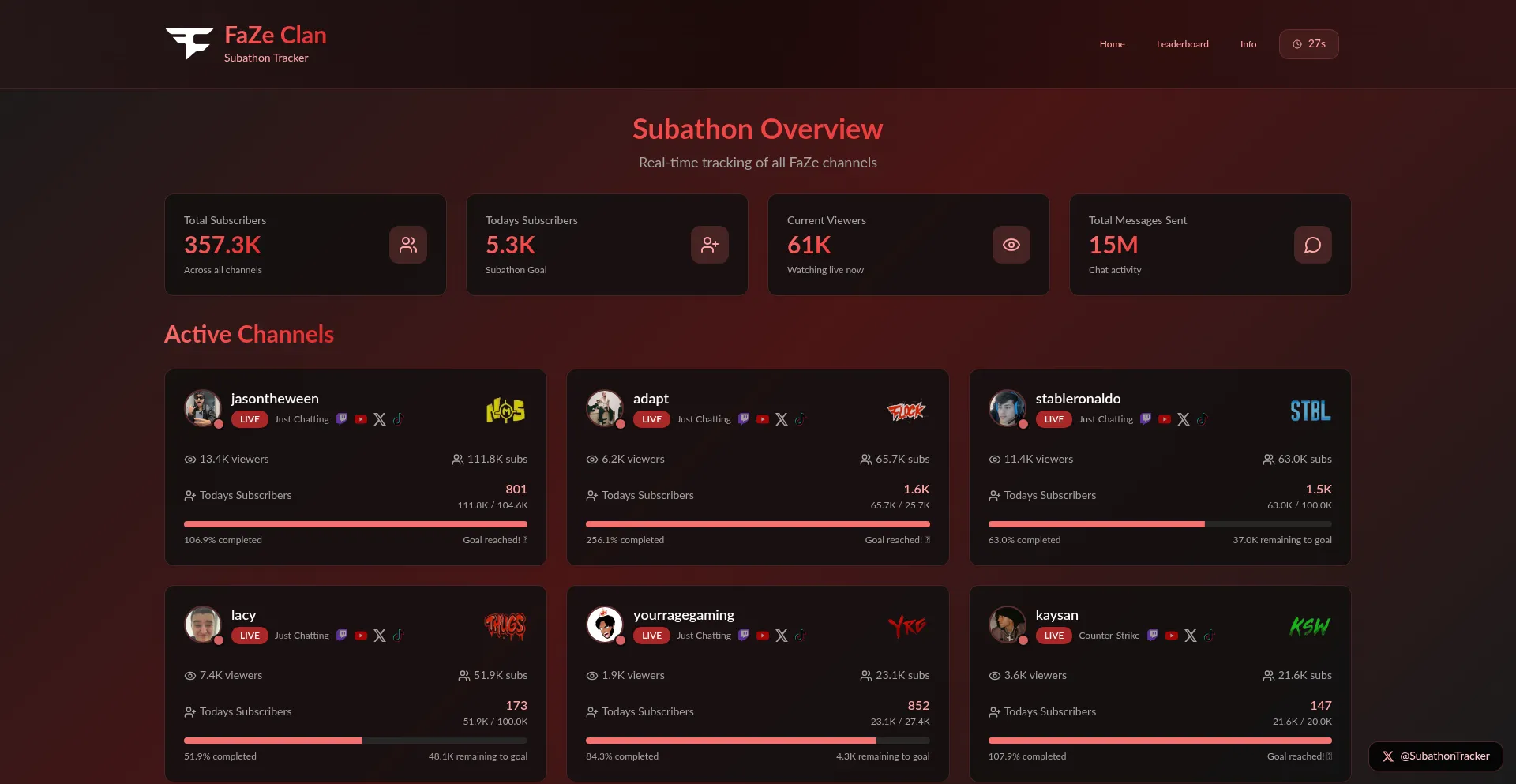 Real-time FaZe subathon tracker with live subscriber counts, analytics, top emotes, chatters, and gifters. Track your favorite FaZe members' streaming milestones.