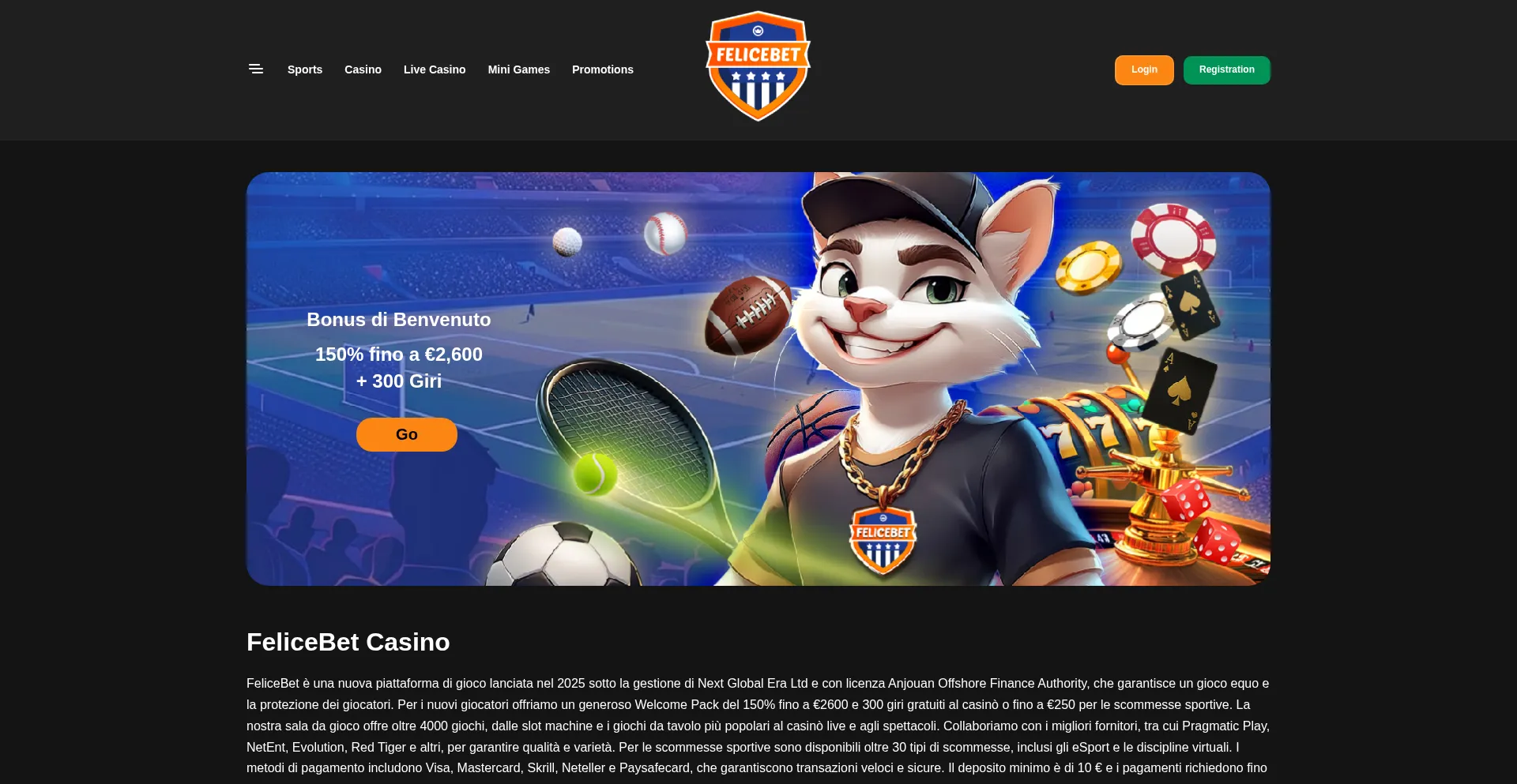 FeliceBet Casino: fino a €2600 di bonus + 300 Giri, 4000+ giochi, scommesse sportive, pagamenti sicuri e assistenza 24/7. Gioca ora!