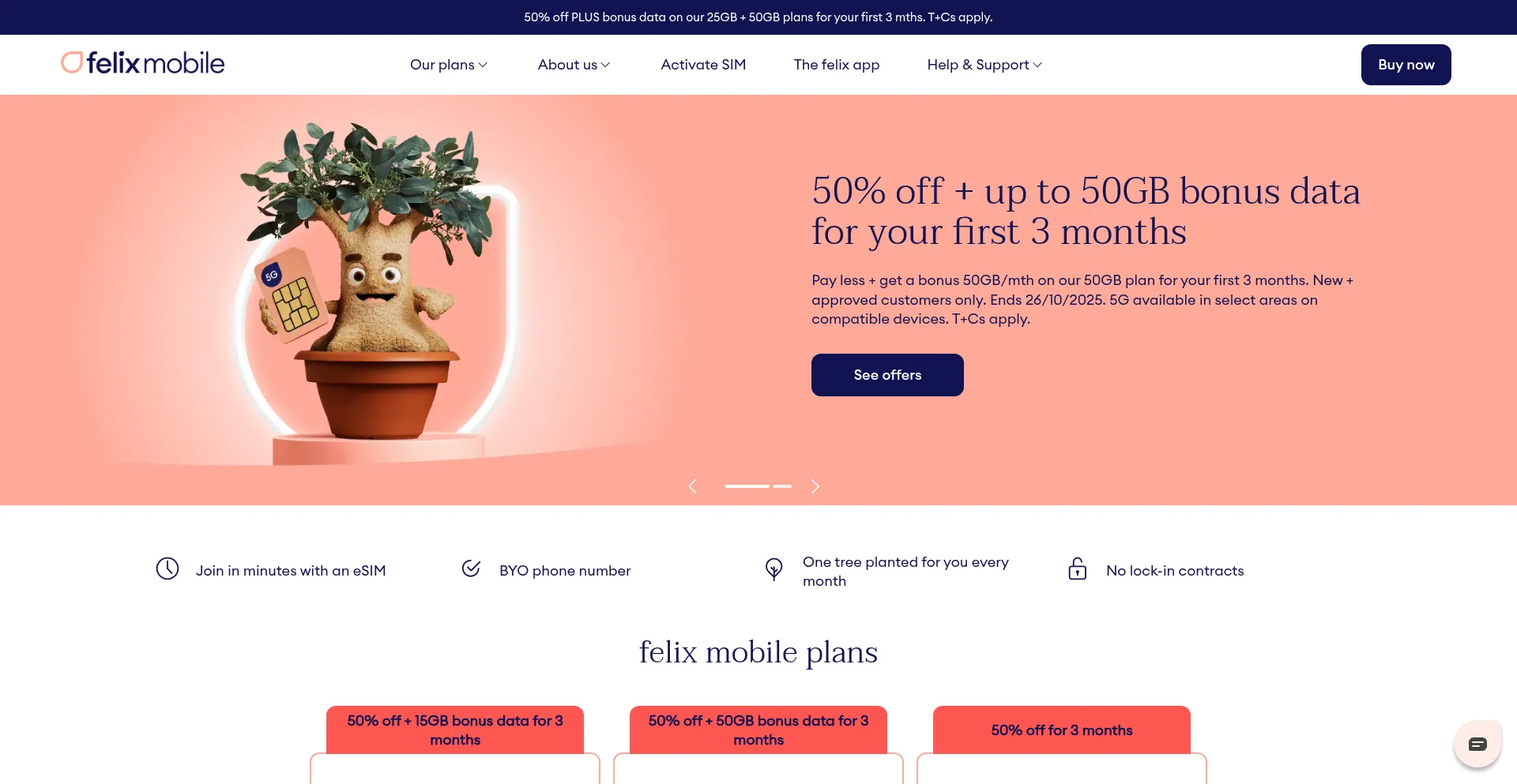 felix mobile offers three great value, no lock-in mobile plans with unlimited standard calls and texts for use in Australia, with one tree planted for every month you’re with ...