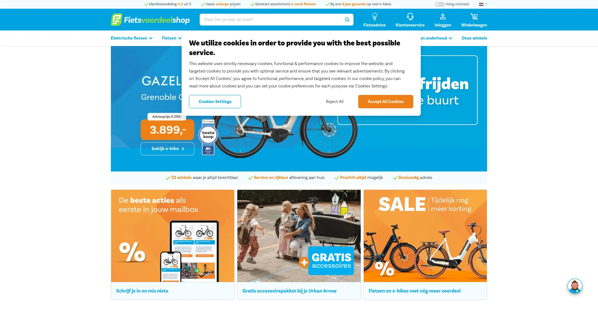 The website implements cookie consent mechanisms in compliance with privacy regulations such as GDPR or CCPA. This demonstrates that fietsvoordeelshop.nl adheres to data protection standards and provides users with control over personal data collection practices.
