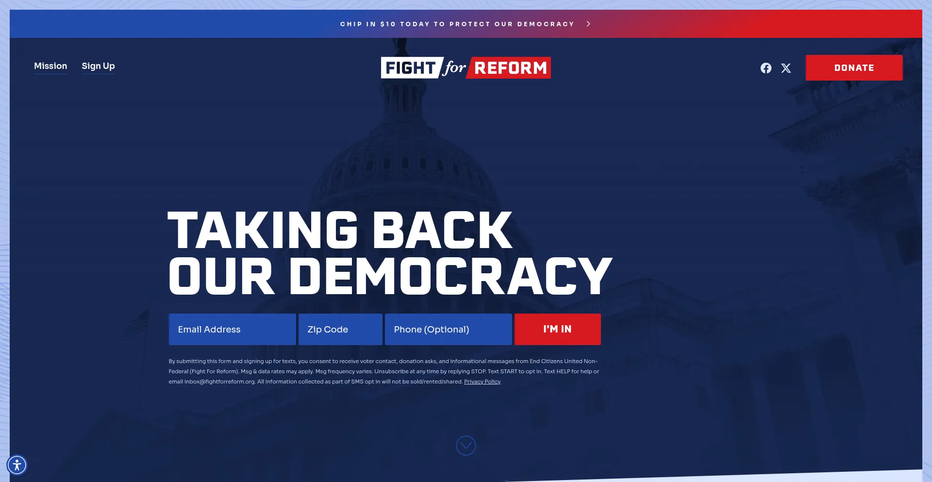 The fight4reform.org website implements data collection forms that may request personal information including names, email addresses, phone numbers, or other sensitive details. Users should verify the legitimacy of it and review privacy policies before submitting personal data.
