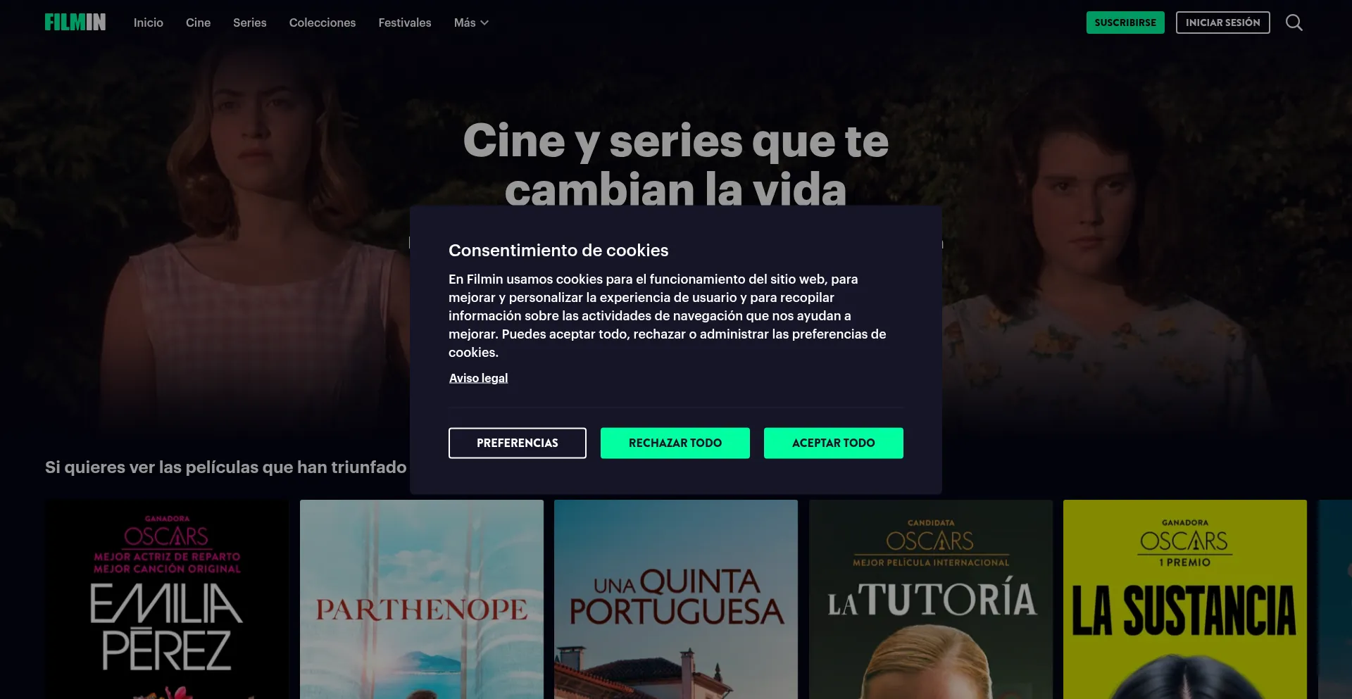 The website implements cookie consent mechanisms in compliance with privacy regulations such as GDPR or CCPA. This demonstrates that filmin.es adheres to data protection standards and provides users with control over personal data collection practices.