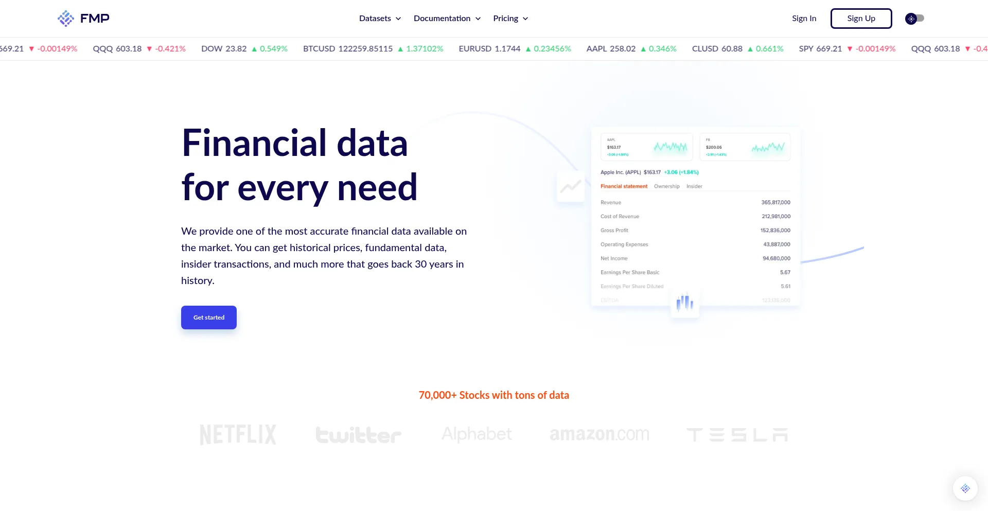 FMP offers a stock market data API covers real-time stock prices, historical prices and market news to stock fundamentals and company information.