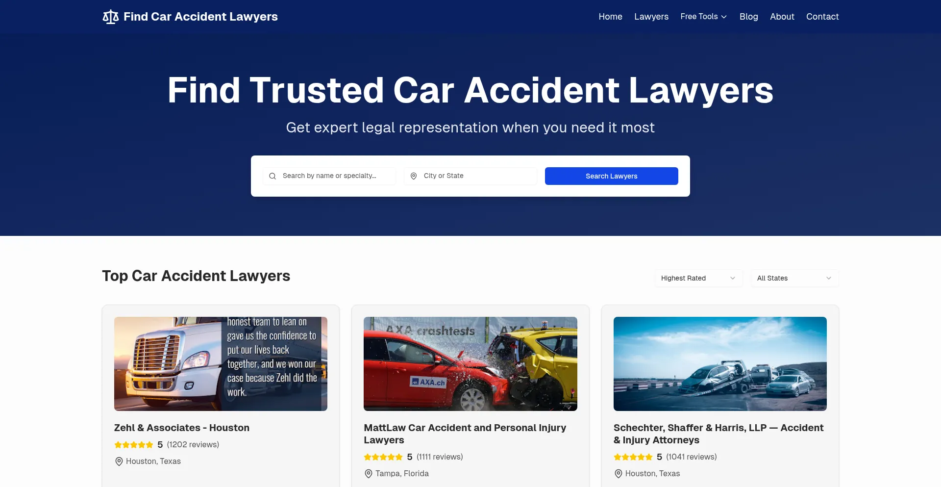 Find the best car accident attorneys in your area. Browse verified reviews, ratings, and contact information for top-rated personal injury lawyers.